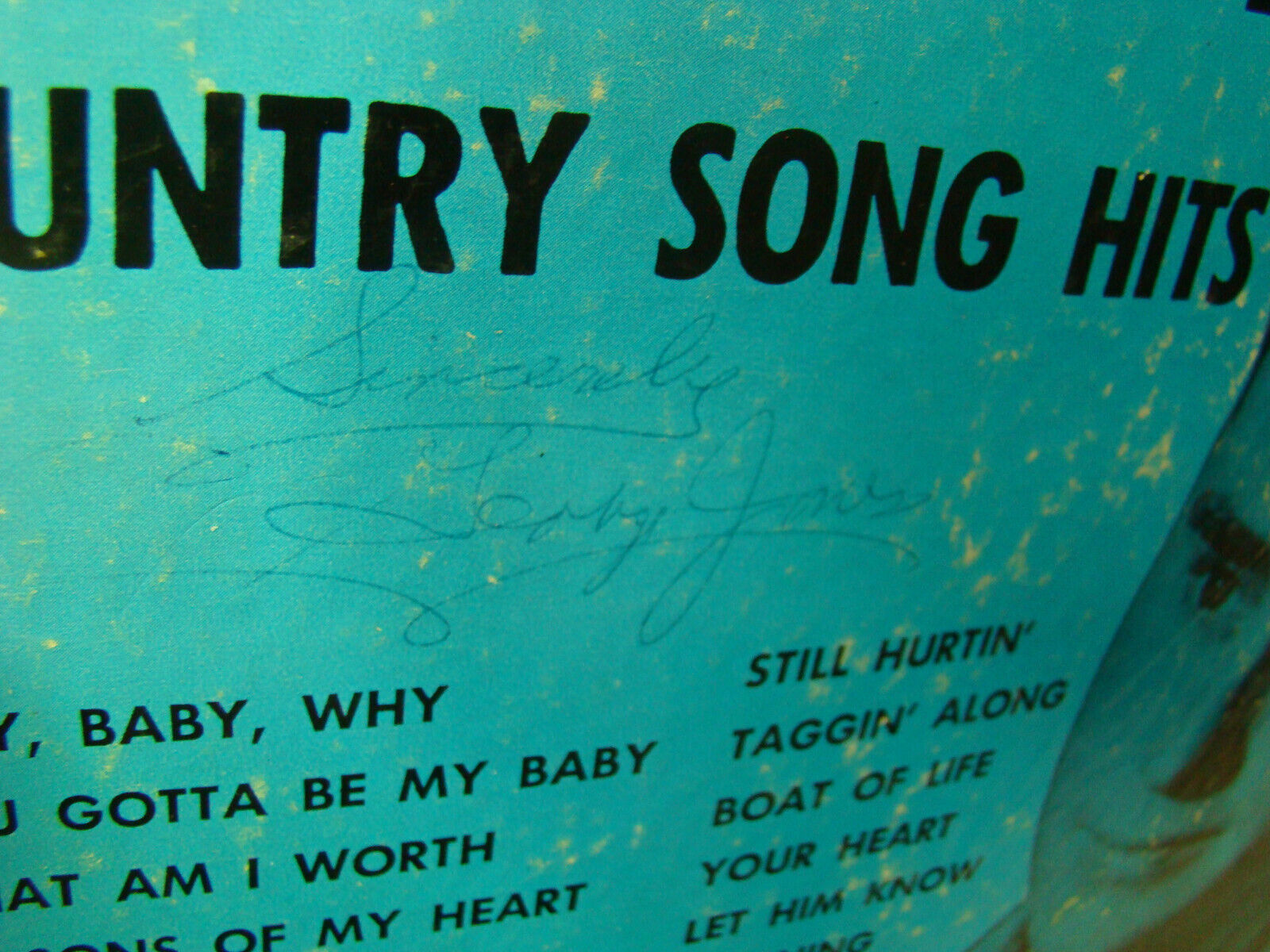 This George Jones album has his signature in pen on the front. "Sincerely George Jones". I found it at an estate sale. I do not know when it was autographed. The blue pen is not very bold on the blue background and it may have faded through the years. I compared it to other autographs. I found the G and the J are the same as he used in his later years. I also found out he did underline his words on other signings. I believe the signature dates to the to time of the record release, 1956.