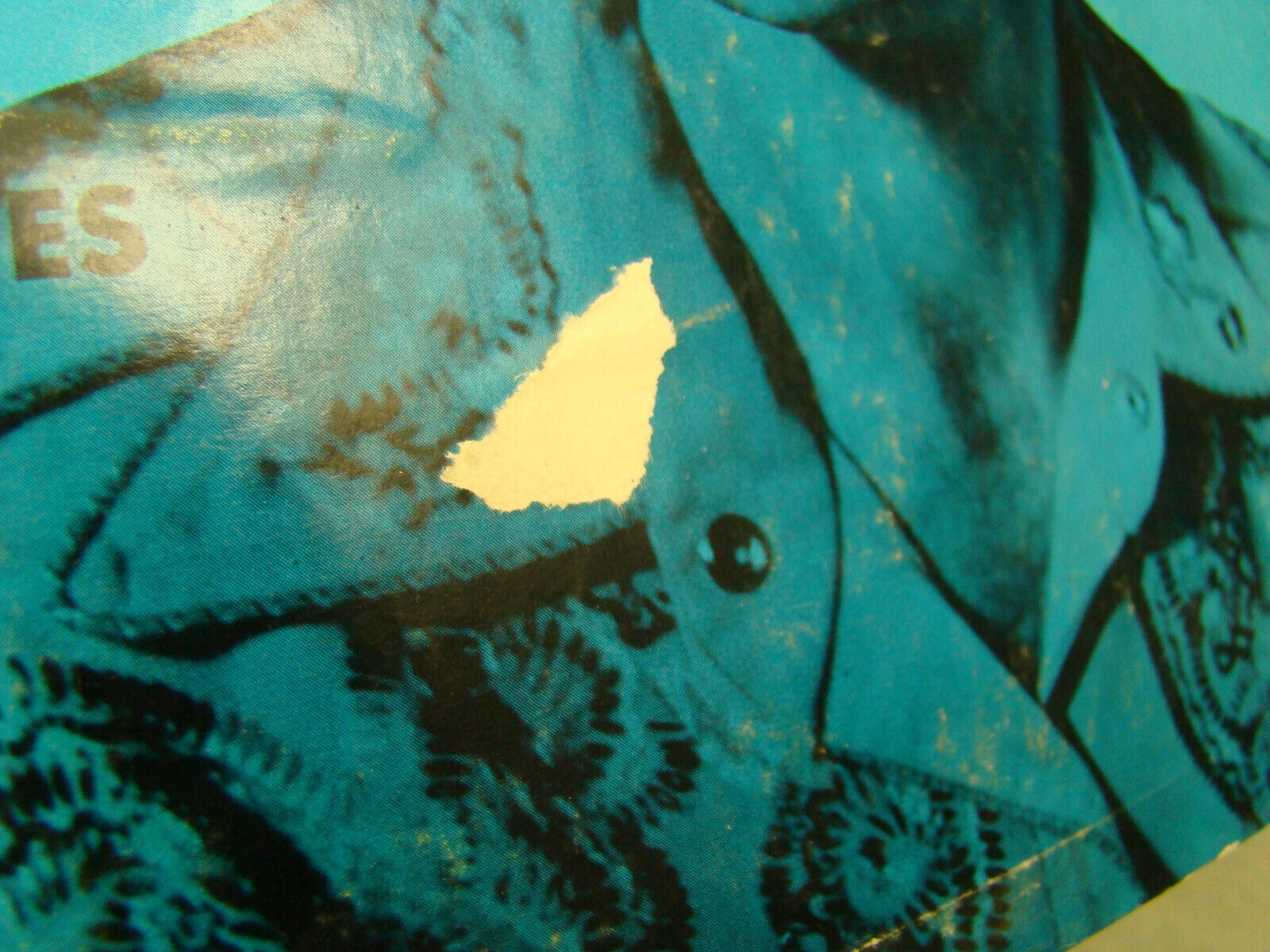 The cover has a scratch on George's forehead, also some blue torn off on his shirt collar.