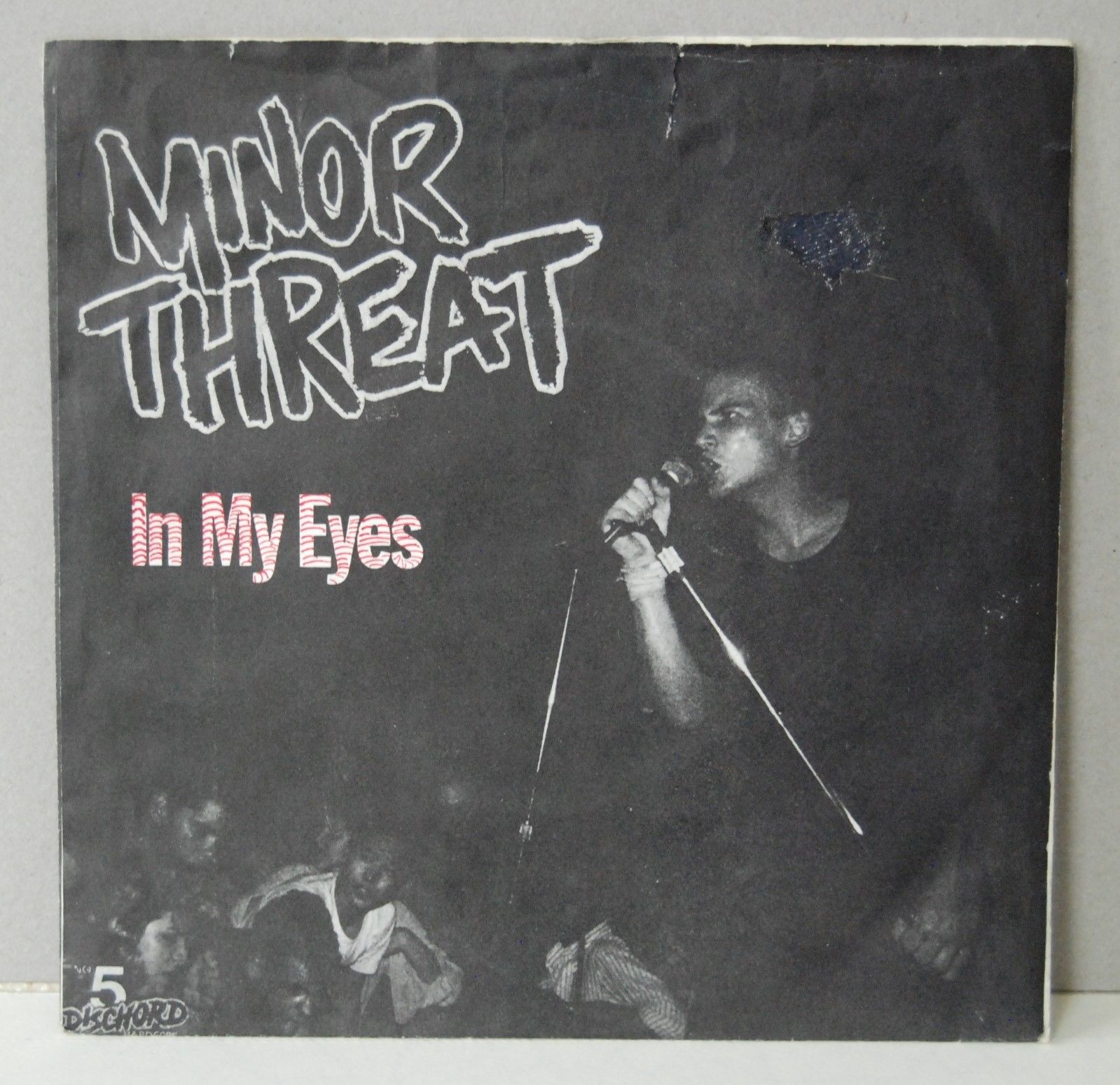 Condition of sleeve shows along the top edge, a very small tear on the left side. Another small tear, slightly longer, just right of center. Shows small repair, upper right corner, from pulled price sticker by coloring damaged area black. The Dischord crew were know to doodle on the covers when assembling the covers, this shows red wavy lines on "In My Eyes" title.