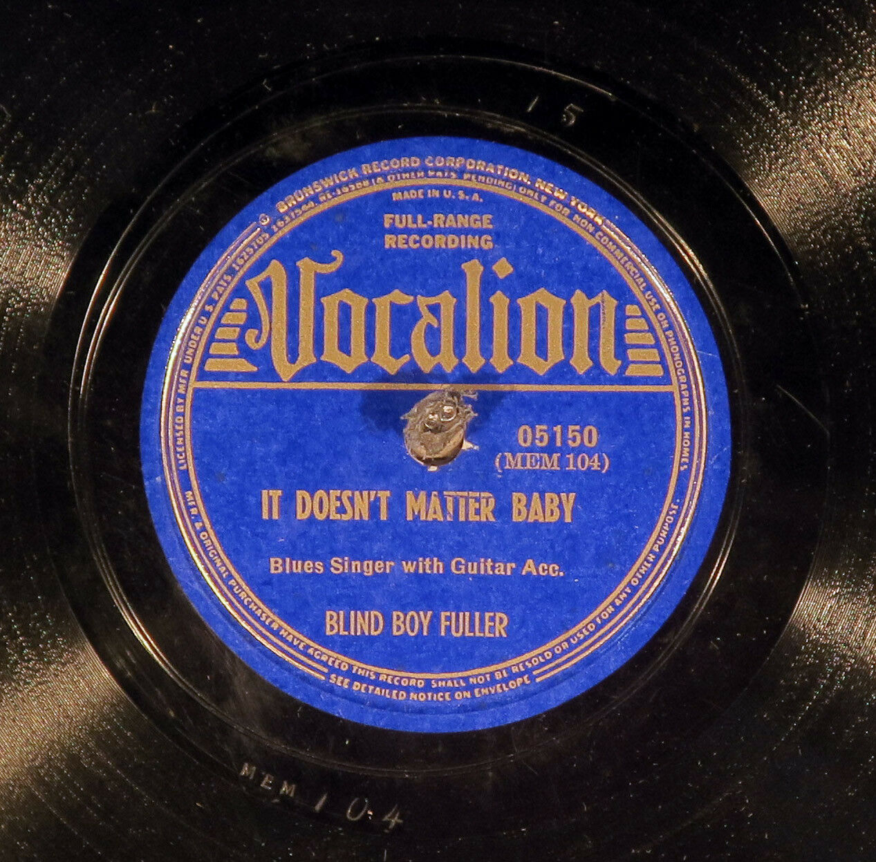 Glossy Blind Boy Fuller Vocalion recorded in Memphis in 1939 with Sonny Terry harmonica added on "Woman You Better Wake Up" and guitar only on "It Doesn't Matter Baby".
