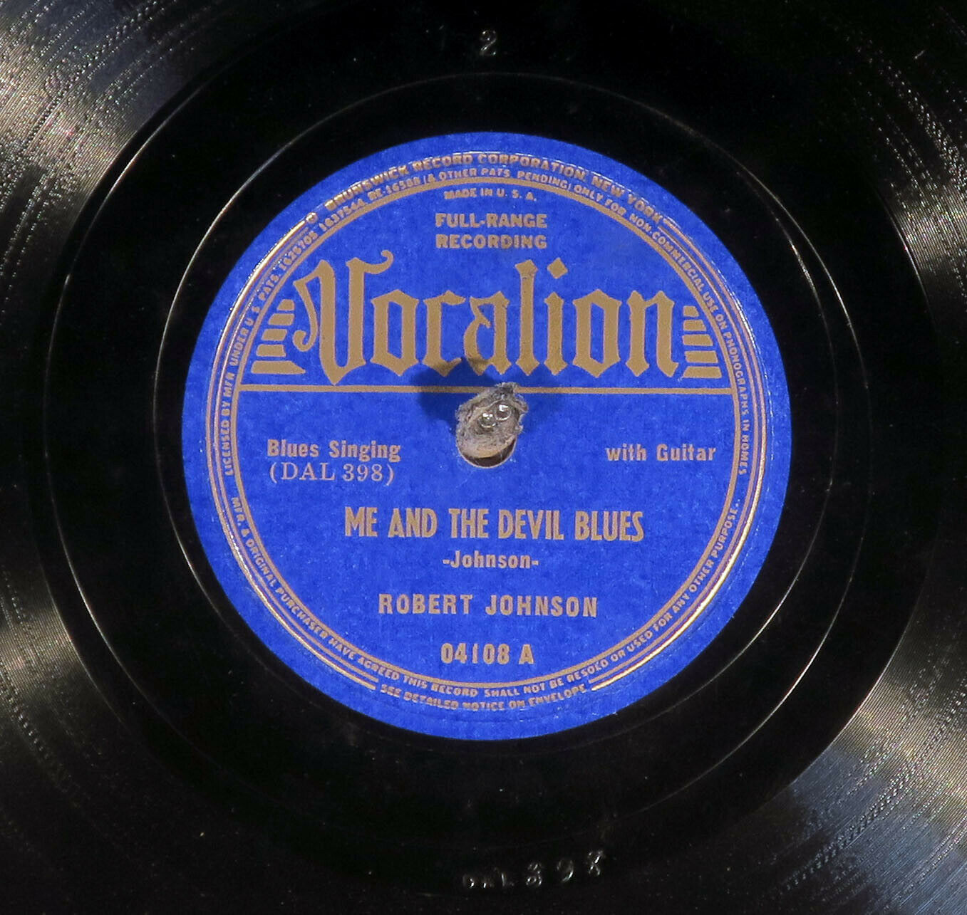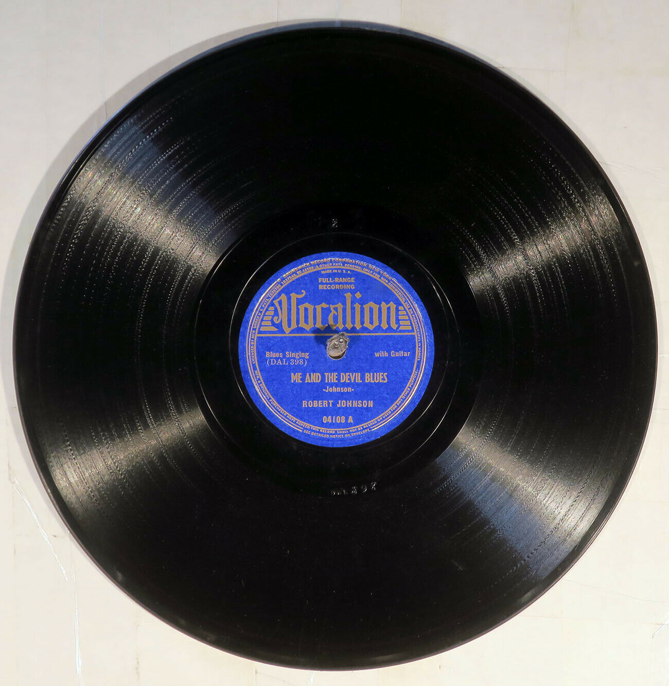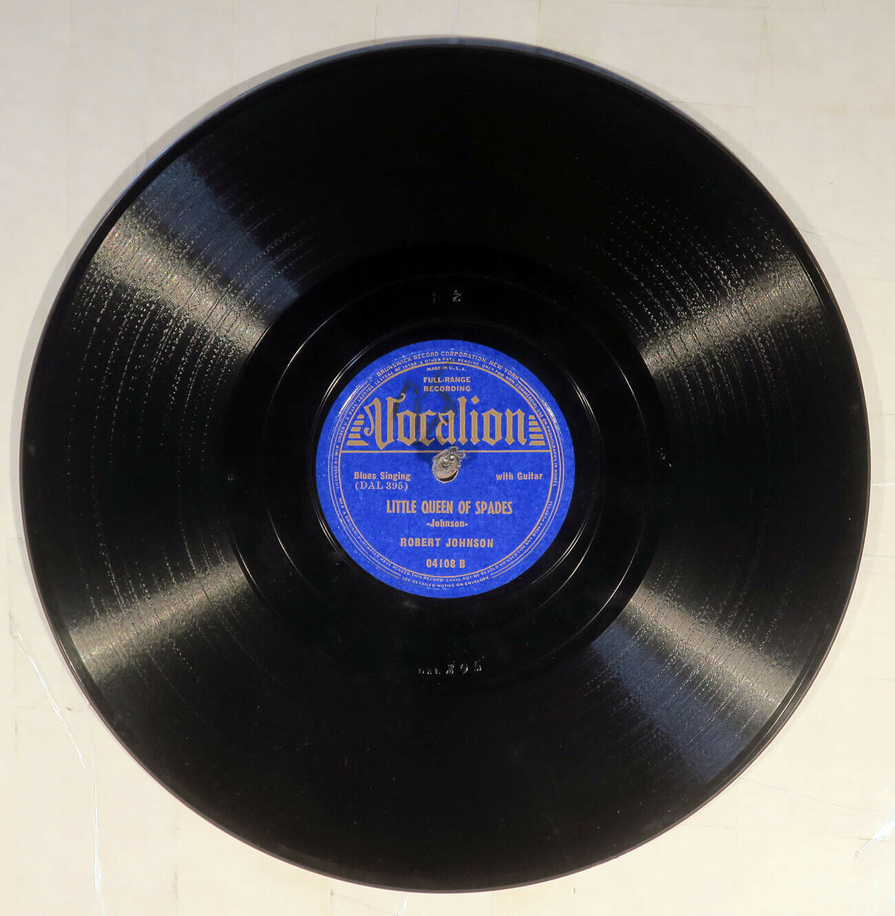 Glossy grooves on this Robert Johnson Vocalion. There are some fine pressure lam cracks on both sides, none of which go through to the other side. No tics from these. Seldom offered scarce Delta blues 78 by the master.