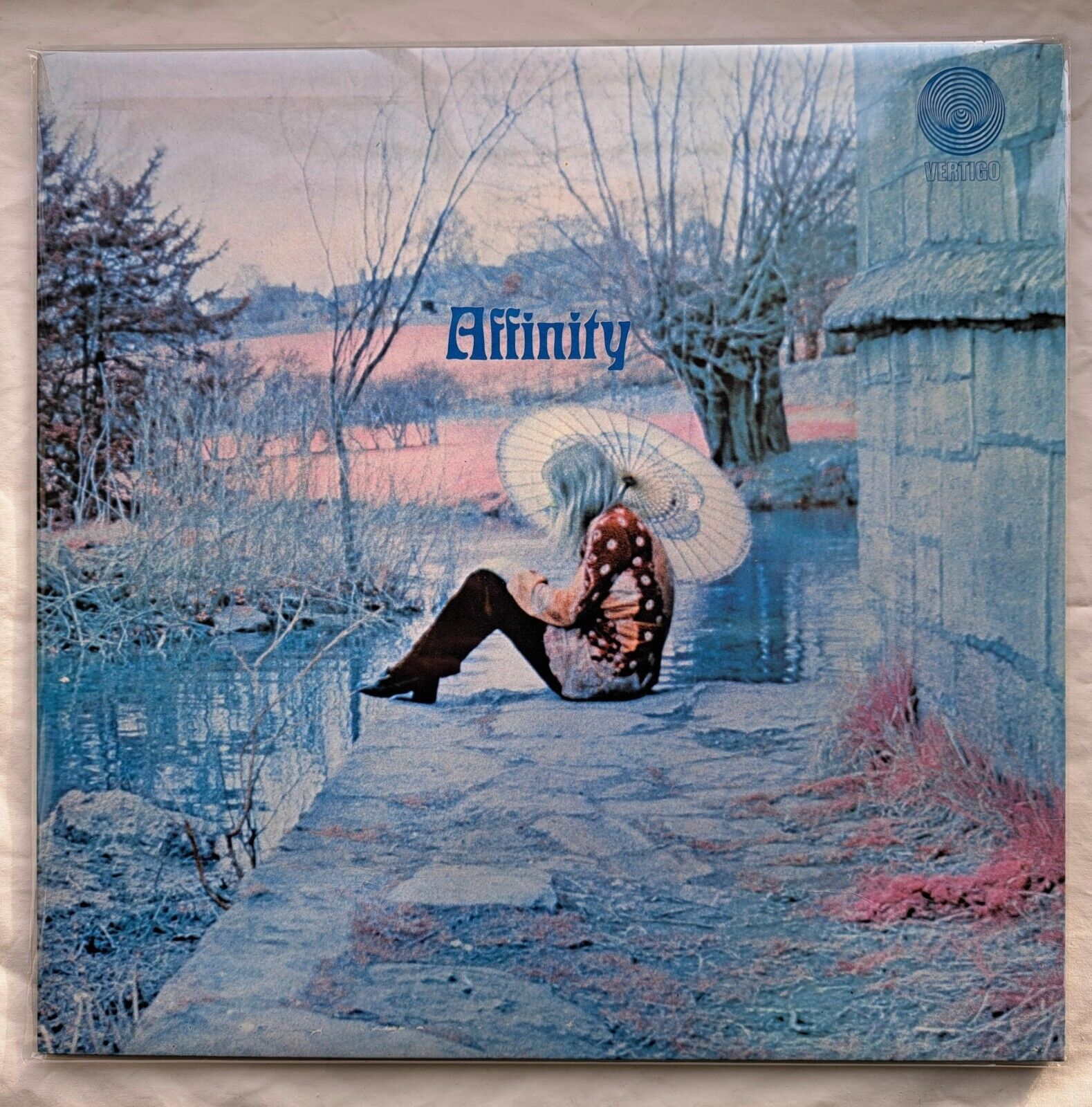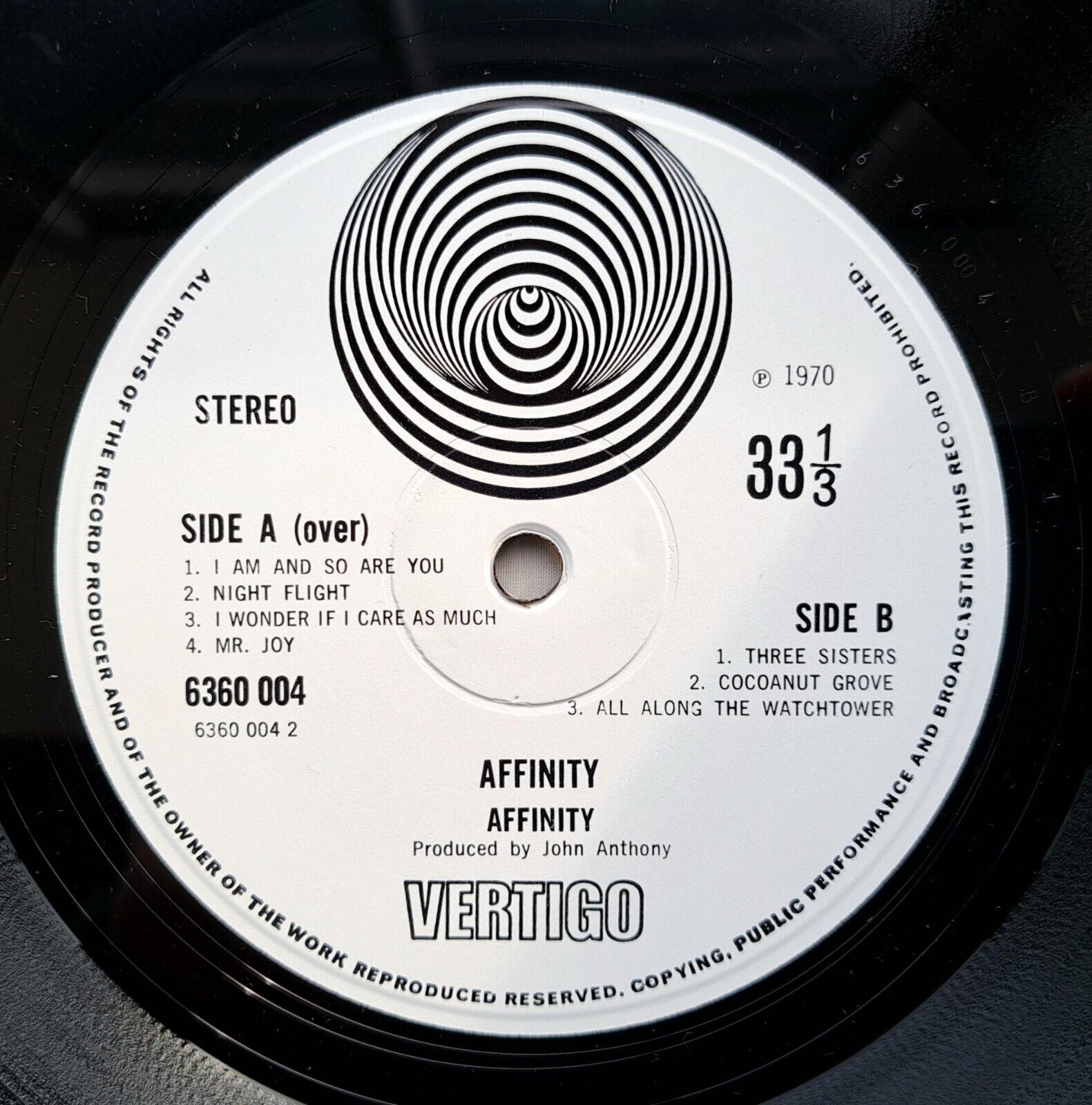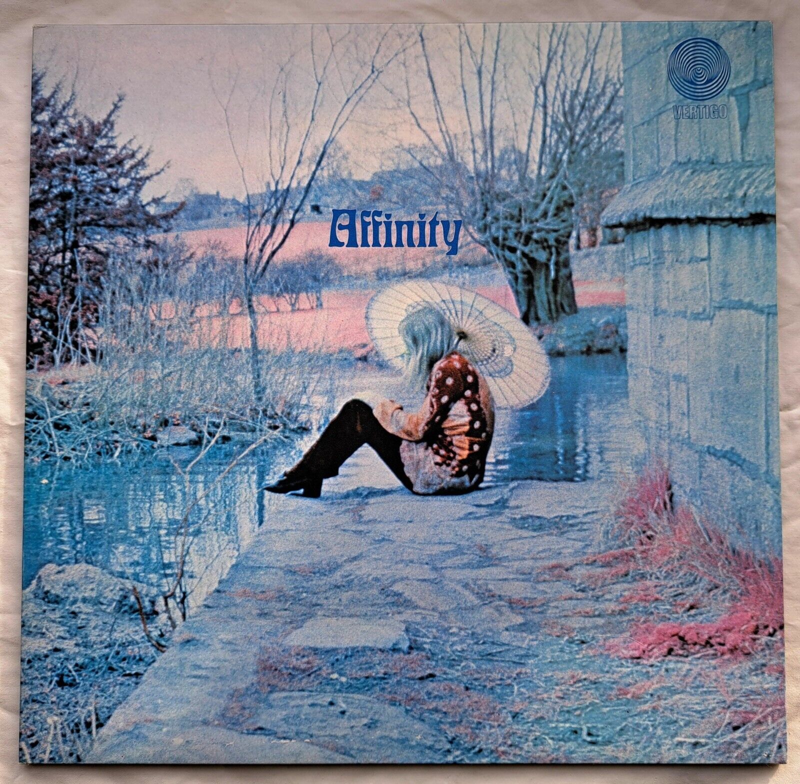 This is the rare first pressing of Affinity's first and only LP simply titled "AFFINITY" (6360 004) as released in 1970 on the collectable "spiral" Vertigo label. This LP is a must-have for any collector of Progressive Jazz Rock music or even collectors of the Vertigo label. The smooth textured gate-fold sleeve is super clean, square virtually almost new mint condition. Both record labels are spotlessly clean as can be seen in the pics and the labels look new with no spindle lines or wear, the black vinyl surfaces are also super clean and shiny with maybe one or two very light hairlines not affecting the sound which is clear and bright making this a very welcome addition to any progressive rock music collection. The band Affinity who featured Linda Hoyle on vocals are legends in the collecting world of psych progressive rock and this album is a true gem for fans of the genre. Whether you're a collector looking to add to your collection or a music lover looking to discover some of the best prog rock music of the 1970s, this album is sure to impress and indeed after the failure of this record in terms of sales the rest of the band went on to bigger things ie. Mo Foster became a very busy session player working with the likes Jeff Beck among many others, Grant Serpell had hits with the band Sailor, Lynton Naiff became a session player working with Queen and last but not least Linda Hoyle went on as a solo artist to record a second and equally brilliant album for Vertigo the fab "Pieces Of Me - 6360 060" with top notch musical backing from among others Chris Spedding and Karl Jenkins.