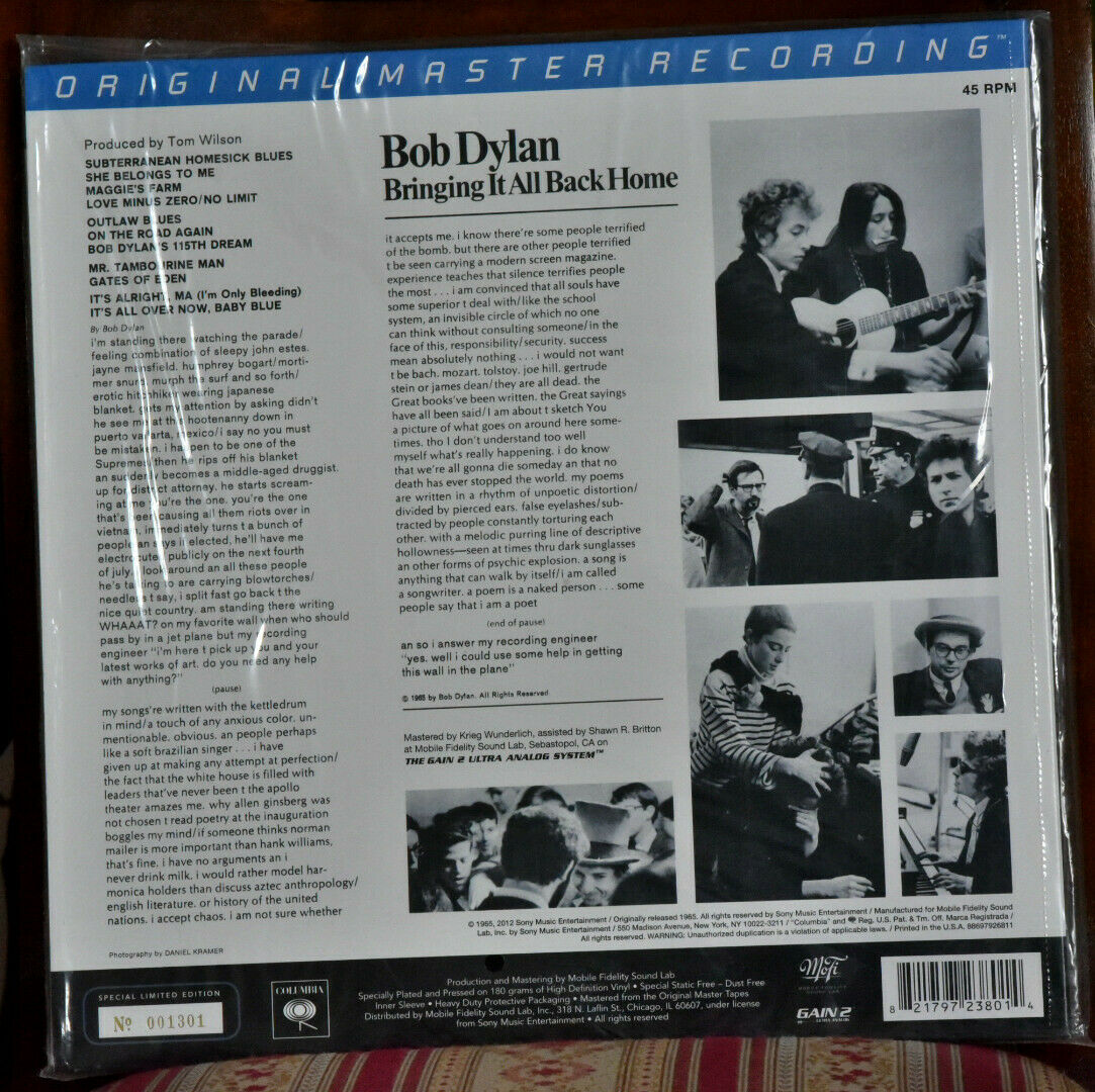 AUDIOPHILE MOBILE FIDELITY MFSL380 BOB DYLAN Bringing Home 180g 2LP No #1301 SS