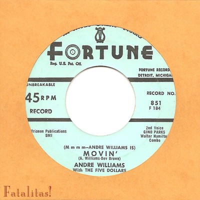 Andre Williams - Andre Williams with the Five Dollars "(M m m m - Andre Williams Is) Movin'" ... Andre Williams & Gino Parks "(Georgia May) Is Movin'" (Fortune-851) Original US press. (Sheldon (stamped) + 851F 184 (hand etched) in the deadwax)