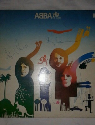 ABBA The Album signed by all 4 members of the band in blue pen on front of sleeve. Record inside has no scratches. Cover is slightly worn around edges.