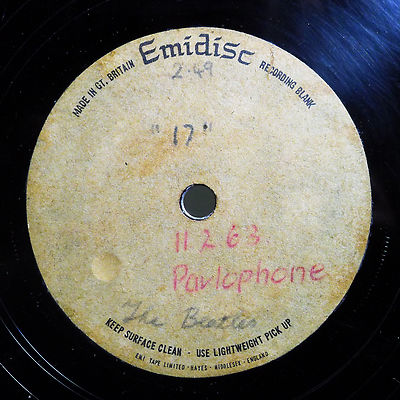 · THE LABEL ON THIS ONE-SIDED ACETATE IS VERY RUDIMENTARY, CONTAINING ONLY THE ORIGINAL SONG TITLE ("17") TRACK TIMING (2 MINUTES, 49 SECONDS), THE NAME OF THE ARTIST (THE BEATLES) , THE RECORDING DATE (FEBRUARY 11, 1963) AND THE NAME OF THE ASSOCIATED EMI LABEL (PARLOPHONE). NO OTHER INFORMATION OTHER THAN EMIDISC LOGO AND THE PRE-PRINTED GENERAL INFORMATION PRESENT.
