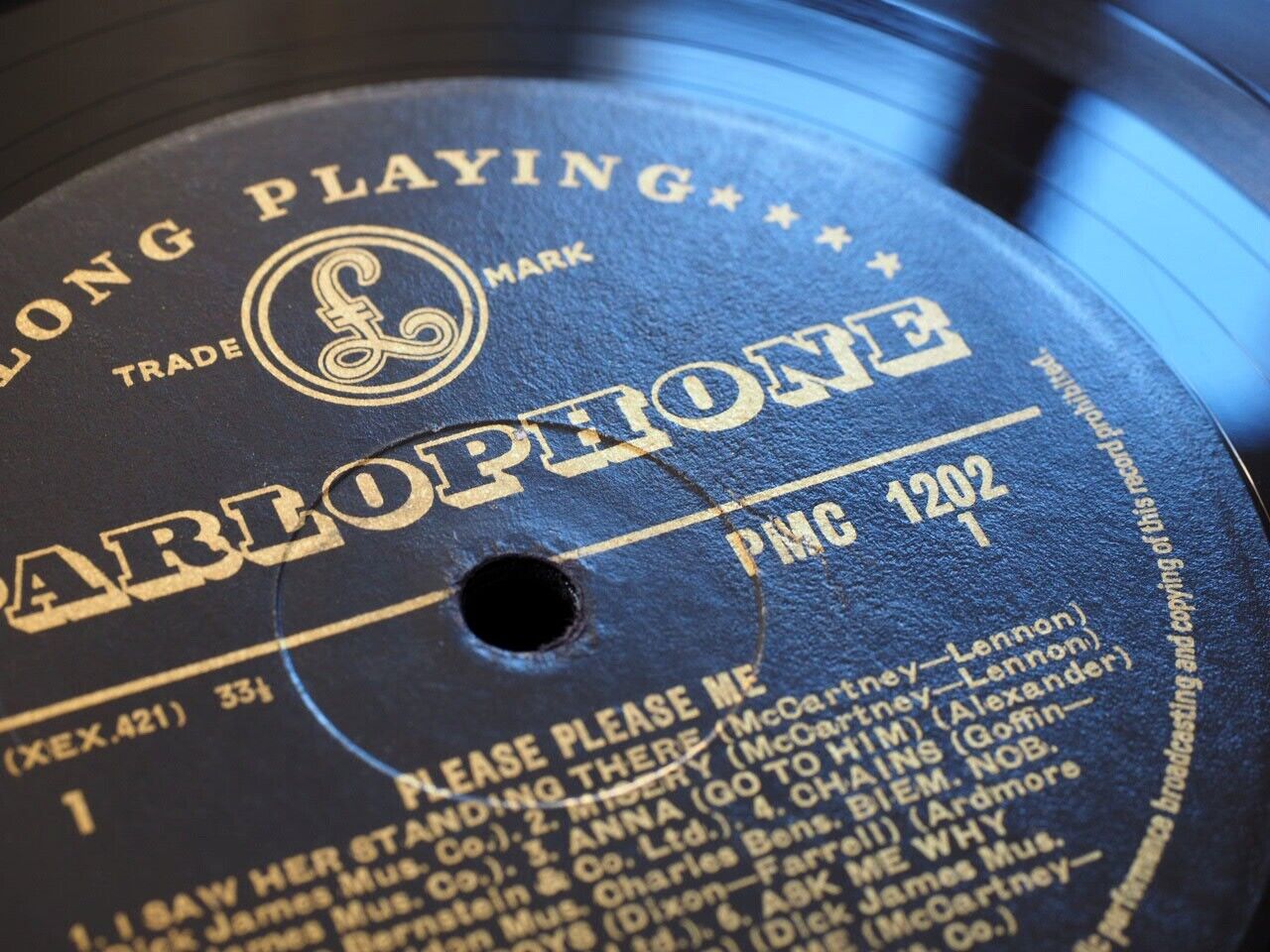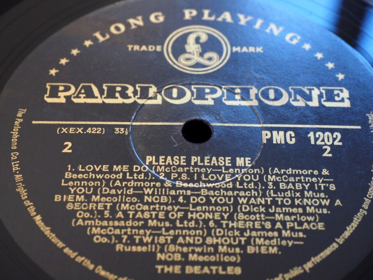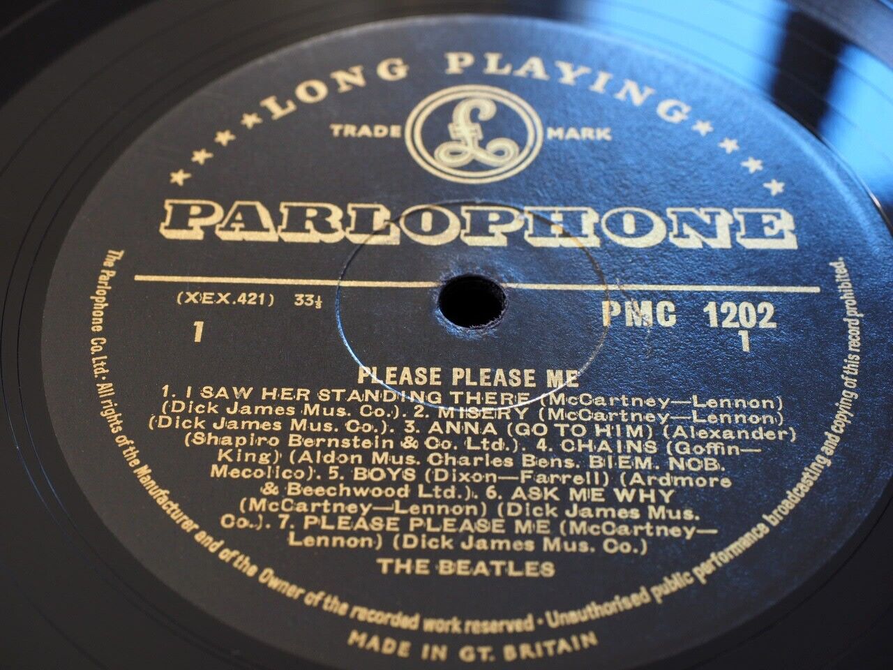 This is an original 1st Ever 1963 issue of Please Please Me in incredible condition. With "The Parlophone Co. Ltd." printed on the rim print and MT Tax credits. No "Recording first published 1963" statement and credited: Dick James Music Co. With No "Sold in the U.K." statement. These points confirm it is the original 1963 pressing of the 1st Ever GOLD label, that has the 33 1/3 text next to the catalogue number.