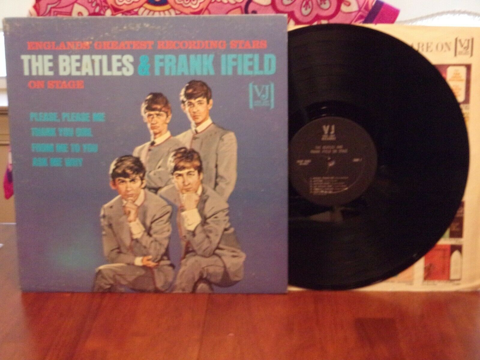 ALRIGHT , CATCH A BREATH . THIS IS MERELY A REPRODUCTION OF THE HYPER RARE PORTRAIT COVER LP THE BEATLES AND FRANK IFIELD ON STAGE . AND A VERY WELL DONE REPO . JACKET HAS SOME LIGHT SOILING ALONG THE BACK EDGES AT WHITE AREA , AND LIGHT RING WEAR JUST AT TOP AND BOTTOM OF FRONT . THE SPINE AND SEAMS ARE ALL SOLID . THERE ARE NO BENDS , PUSHES , SPLITS , TEARS , HOLES , SAW CUT , STAPLES , STICKERS , WRITING , OR TAPE . THE BLACK WITH SILVER PRINT LABELS ARE COMPLETELY CLEAN , AND THE VINYL IS EXCEPTIONALLY BRILLIANT , MINT CONDITION . THIS IS A GREAT FILLER UNTIL YOU FIND A REAL ONE ! IT WOULD LOOK NICE FRAMED , AS WELL . ALBUM WILL ARRIVE WITH A STOCK VEE JAY COMPANY SLEEVE .