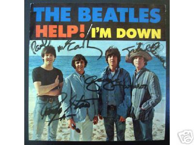 Item B7-126: A fully autographed Help 45 picture sleeve, acquired in 1974 from a Capitol Records executive, whom I had to track down in L.A. . . When I did, he was reluctant to sell; having no reason to. In the end, I believe he did because of my enthusiasm, because he had no one to leave them to, and because he had several signed pieces, this being his least favorite. (You should have seen what was on his Office wall. . .) The signing took place in August 1965, during the Beatles week long stay at a rented house in Benedict Canyon, L.A; while finishing up their tour. The sleeve itself would grade NM, with zero ringwear, splits, etc. (As it should be- it was brand new when signed, the record never kept inside). Even the colors show no sign of fading. I grade it NM because it was never framed, and over the years, has been handled by various friends and viewers, but it s basically Mint. The signatures are not - They already had the same few slight smudge and fade marks when purchased (but I don t think they detract at all from this piece s stunning look). He explained: (and I paraphrase). . .