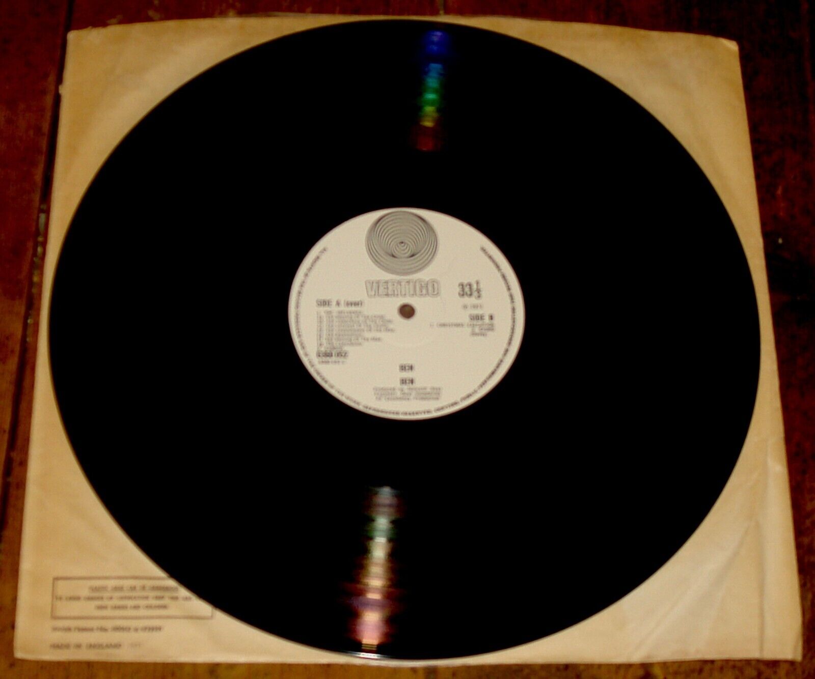 - THE DISC IS IN LOVELY CONDITION, VISUALLY PLEASING, WITHOUT WORRYING FEELABLE SCRATCHES, RUBS, OR SURFACE MARKS. THE DISC DISPLAYS A DEEP GLOSS, AND RETAINS A BEAUTIFUL SHINE AND LUSTRE. THE RECORD APPEARS TO HAVE BEEN LOVINGLY PLAYED SPARINGLY, IF AT ALL, AND PLAYED WITH A GREAT DEAL OF CARE. THERE ARE NO NOTICEABLE SURFACE MARKS. THE RECORD TEST EXTREMELY WELL, POWERFUL AND PUNCHY, WITHOUT INTERRUPTION DURING PLAYBACK, NO MAJOR LOSS IN SOUND QUALITY OR AURAL PERFORMANCE, AND NO WORRYINGLY OBTRUSIVE POPS OR CLICKS. BOTH SIDES CAN BE ENJOYED ENORMOUSLY. IF ANY, ALL FAULTS ARE MINOR, ACCEPTABLE, AND NOTHING TO WORRY ABOUT TOO MUCH.