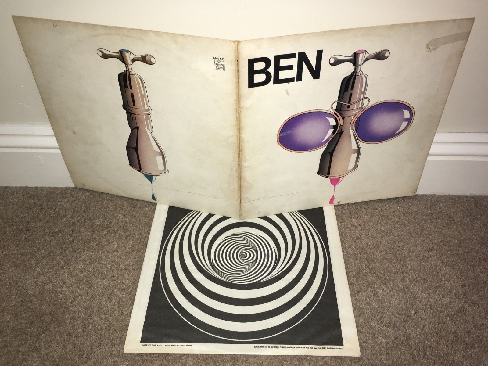 Original 1971 UK 1st Press unlaminated gatefold sleeve complete with original ultra clean unaged and 100% unsplit inverted swirly inner!!! IMPOSSIBLE to find this sleeve in anything approaching a good condition - most are spent, torn and worn with HEAVY wear and DRASTIC ink rubbing due to age and the lifestyles of the buyers of this particular LP!!! This one is not too bad at all, and looks GREAT, especially considering the nature of these fragile sleeves!!! NO graffiti OR writing, NO splits OR excessive wear, and still strong and solid after all these years!!! Only has a few usual signs of ageing such as a small amount of ultra light creases and a touch of a record imprint, some light signs of general mild ink rubbing and ageing in places such as a few minor storage spot and a surface tear to the top right of the front (INCREDIBLY common with this sleeve - minimal compared to most), some minor dust spots to the centre of the inside and just a touch of minor vague water discolouration along part of the spine (nothing overly drastic at all), a touch of denting to the four corners which basically ALL vintage LP's have, and POSSIBLY (just to be sure!!!) one or two other minor signs of age here and there, though nothing that really stands out to note at all!!! And that's truly about it!!! I tend to bring it down by listing the most minor negatives I can find, but this is still a BRILLIANT sleeve, and it's a TRUE rarity to find one as strong, vibrant and as together as this - most have been virtually destroyed, really heavily worn, or are just about being held in one piece, but not this one!!! It remains ultra strong, solid, unsplit and unspoilt, and even the spine remains ultra strong, solid, unsplit and 100% readable!!! Must grade overall at least as Good+++!!! (graded STRICTLY to the UK RRPG standards, not trashed or overgraded AT ALL!!! Customer satisfaction is of 100% importance to me)