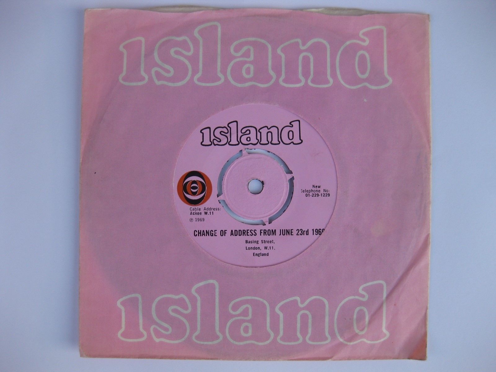 'Change of Address' side has at the top the pink "island" logo. On the left hand side is the circular black and red and pink logo, and underneath, the text "Cable Address: Ackee W.11 p. 1969". On the right hand side the text "New Telephone No. 01-229-1229". On the bottom of the label are the words 'CHANGE OF ADDRESS FROM JUNE 23rd 1969' and in smaller type "Basing Street, London, W.11. England". In the space between the end of the recording and the label are the words "BASING STREET".