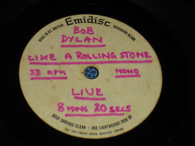 Looking under very strong light I have just noticed there is another EMIDISC label under the one with pink writing that gives the information: Bob Dylan, Like A Rolling Stone and Live - in black writing, obviously this information did not give all the details needed to play the acetate on air, like length of track and speed (33rpm) hence another label was added on top with all the relevant information for airplay written on it clearly.
