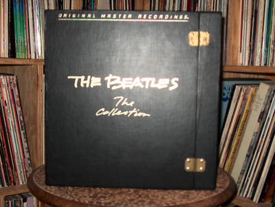 You're bidding on THE BEATLES - "THE COLLECTION" box set of Original Master Recordings by Mobile Fidelity Sound Labs on vinyl. I purchased this box set new when I worked for an Audio store and it is part of my personal collection. The records have seen some play but have been well cared for and only played on "high-end" turntables (Linn or Rega). The surface of all the records are clean. The box is in good shape but the hinges have tarnished from storage over time. The booklet & album covers have been stored in the box the entire time and are in very good condition. This set is # 3025 out of the 25,000 produced. Geo-Disc cartidge alignment tool included.