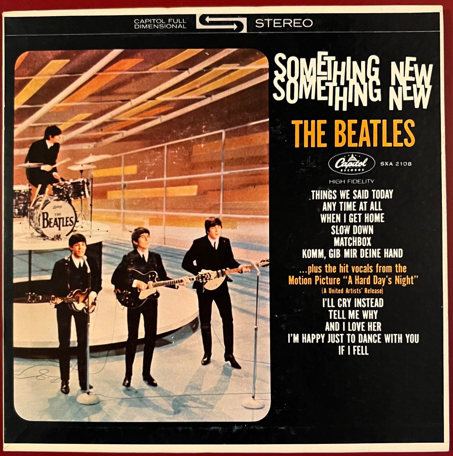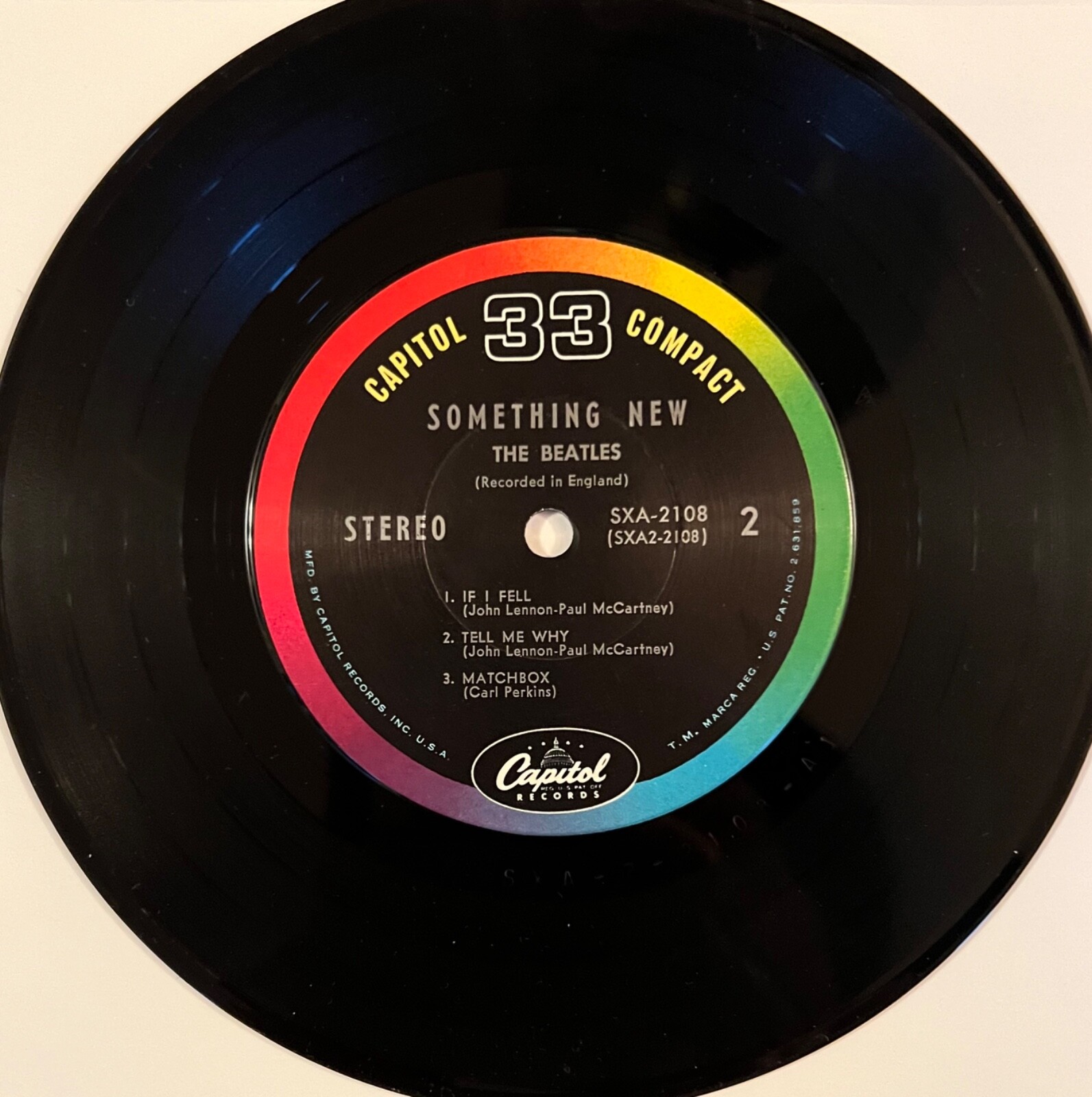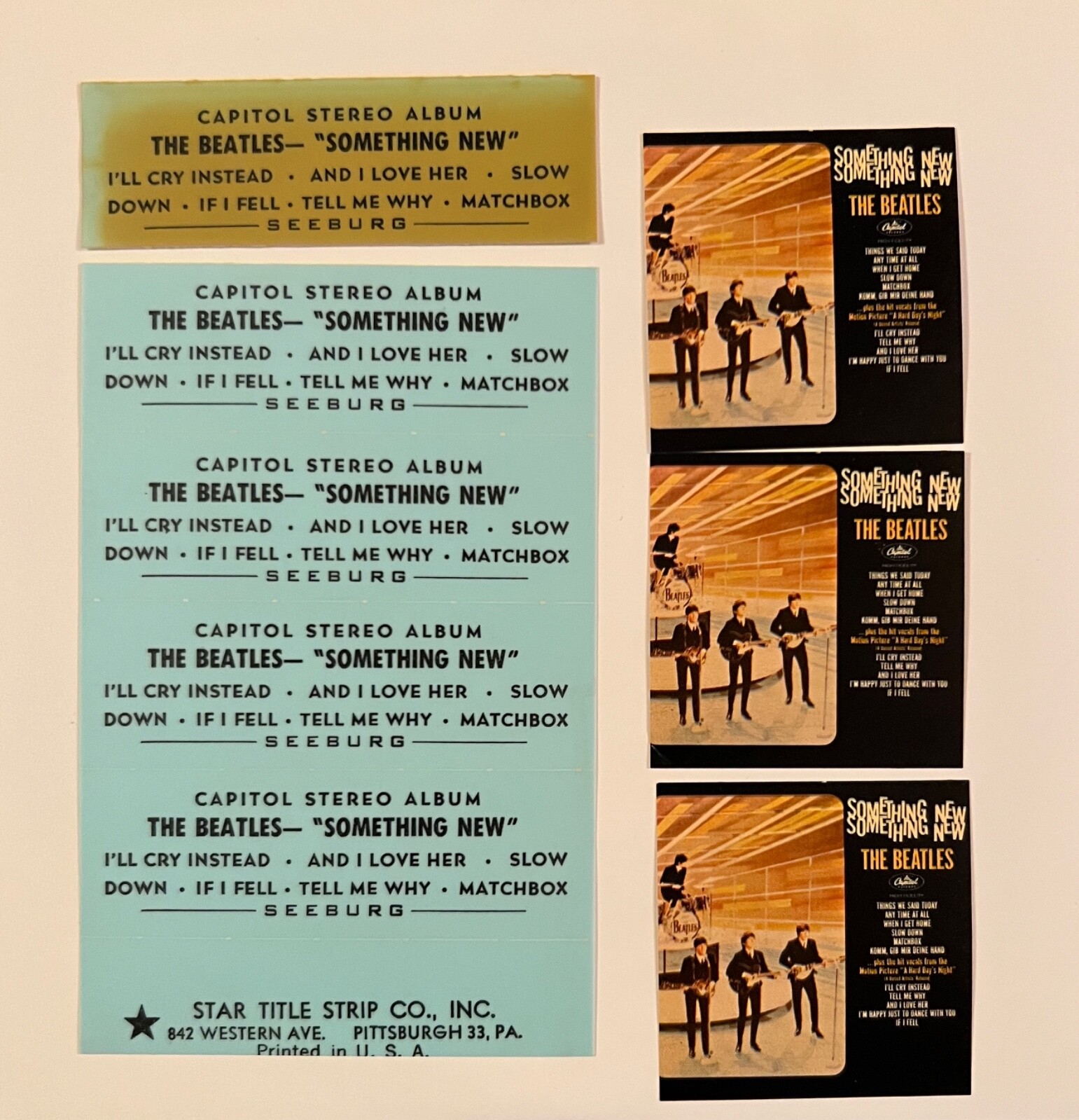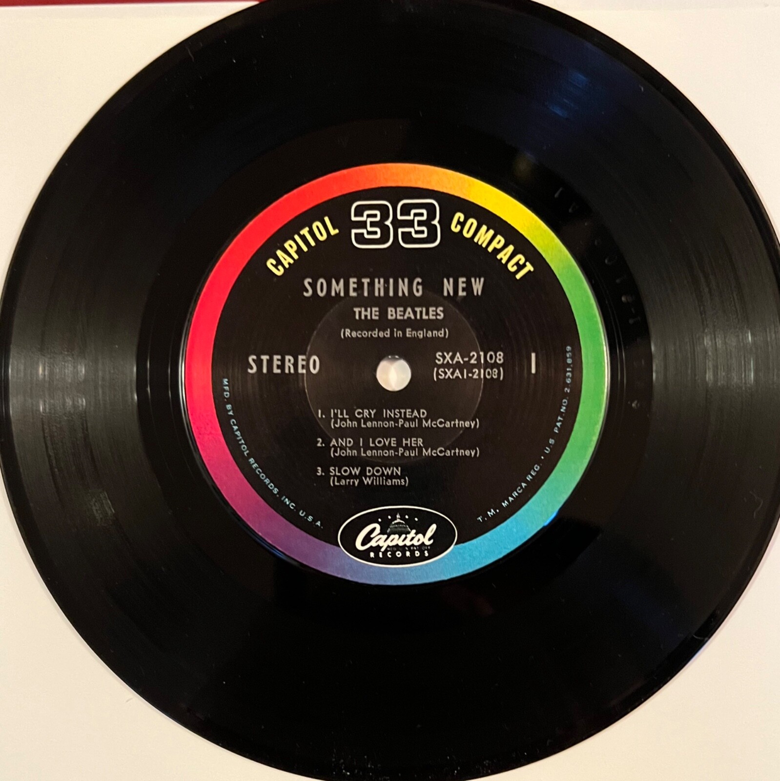 Beatles Something New 33 1/3 Stereo 7 Inch Jukebox EP. These jukebox EPs were only available to jukebox operators who vended the machines that were capable of playing both 45 and 33 1/3 stereo 7 inch records. They are rare in any condition. This copy is Excellent Plus with a sleeve that is Excellent with no seam splits or wear. Also included are the title strips and 3 of the small inserts. You would have a hard time finding a nicer copy unless you were lucky enough to find one still sealed. I will send this via USPS Ground Advantage with full insurance.