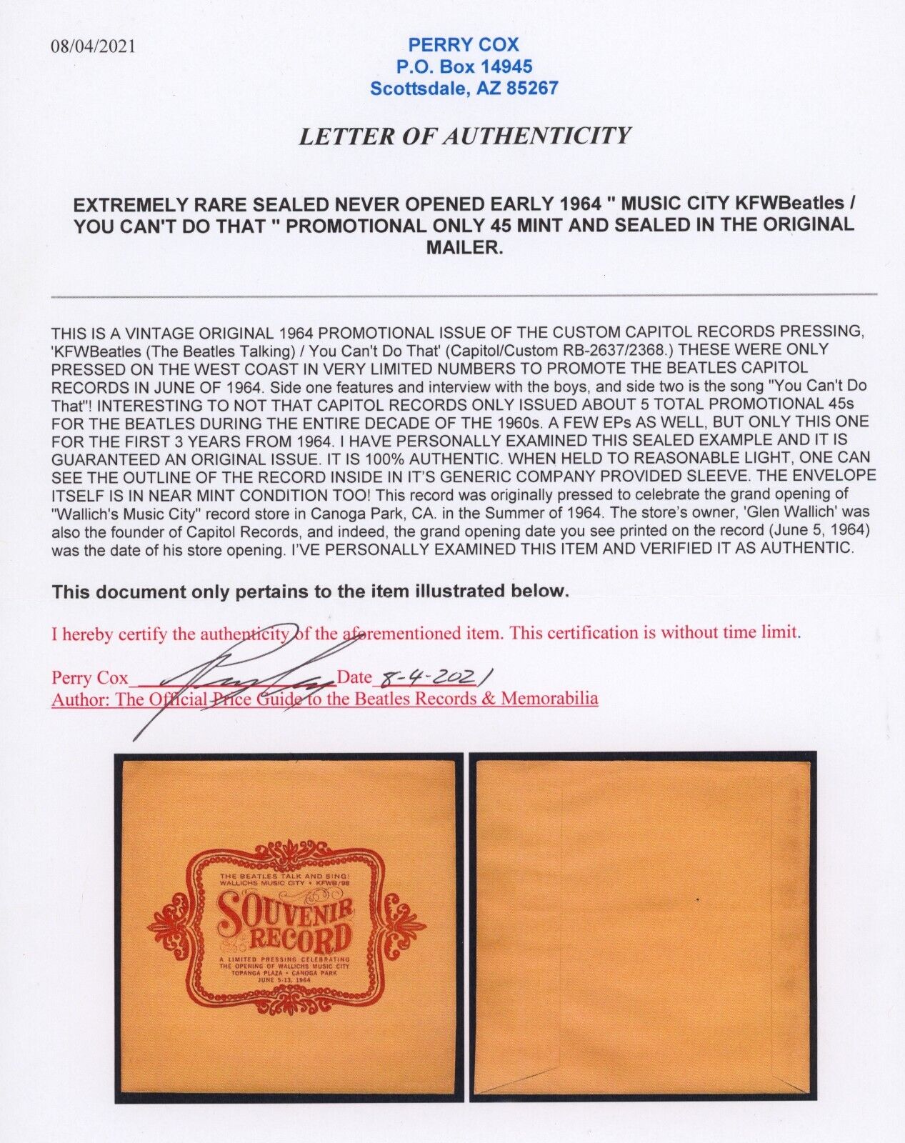 Includes COA from Perry Cox, dated August 4, 2021. On the COA Perry notes: "When held to outside light one can reasonably see the record inside in its generic company provided sleeve. Interesting to note that Capitol Records only issued about 5 total promotional 45s for The Beatles during the entire decade of the 1960s (and a few EPs as well). This disc was the only promo issued for the first 3 years from 1964."