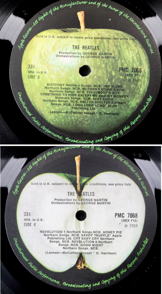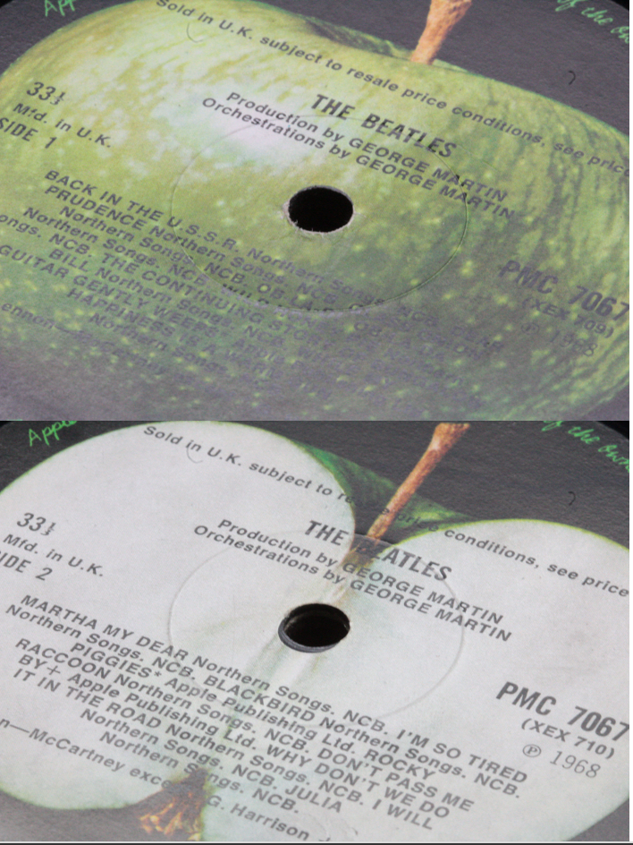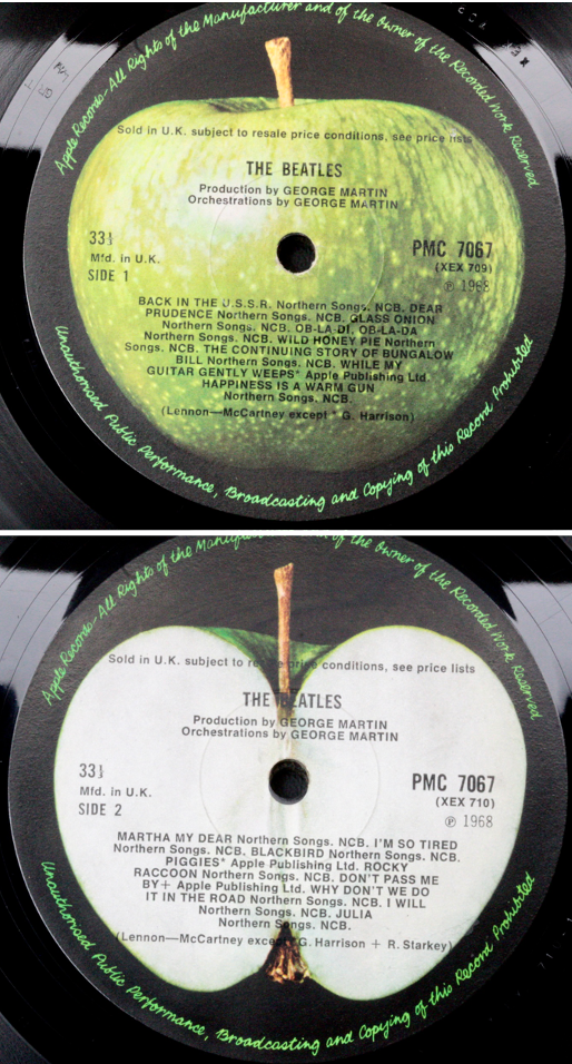 The dark green Apple labels are the first variant in which the text: 'An EMI Recording' is not present on any of the four labels. This was added to subsequent variants.