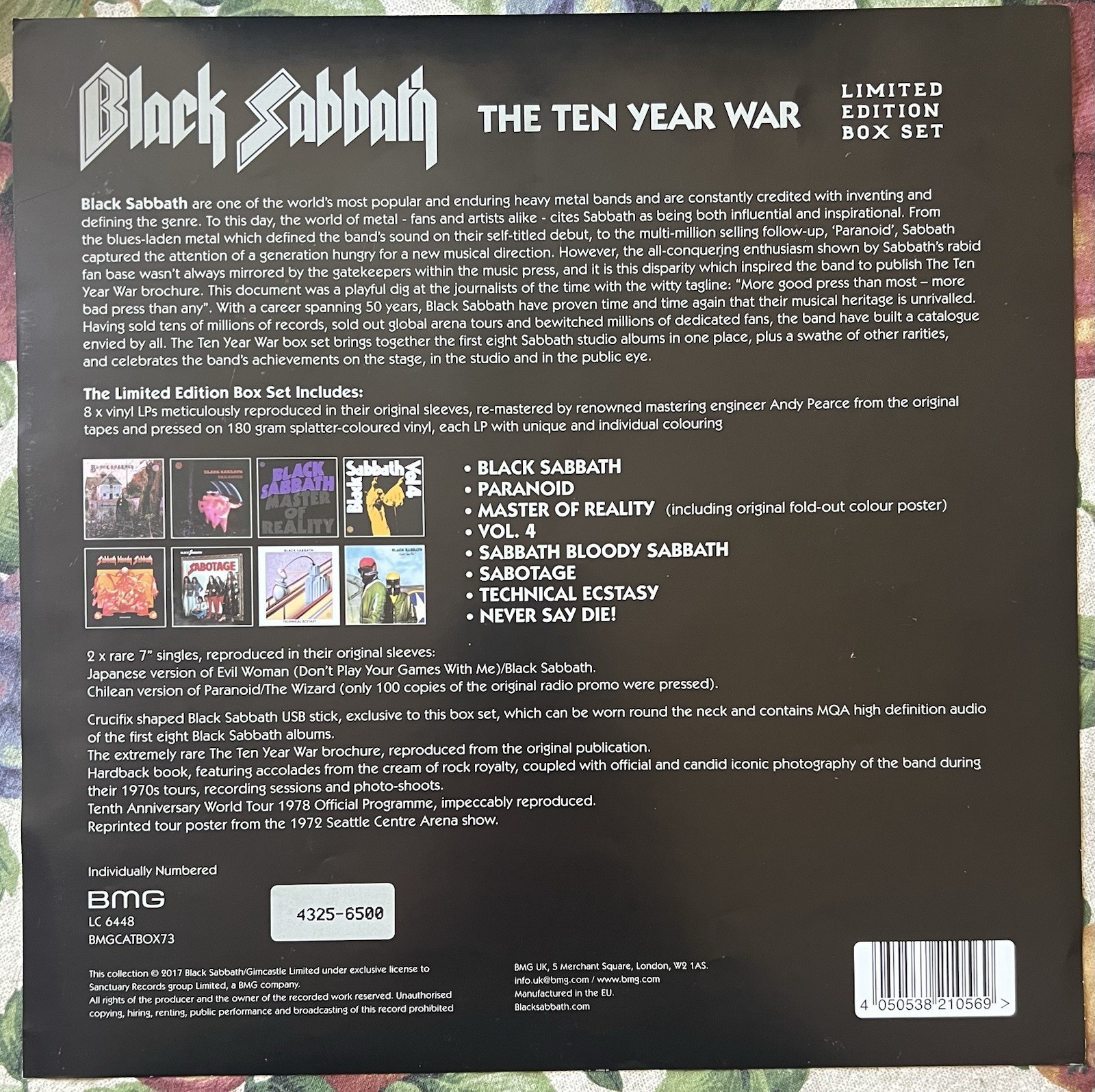 Black Sabbath , "Ten Year War" Limited Box Set from 2017. BMG label. Box is in excellent condition. No splits. A little bit of wear on the bottom of the lid. Records are all colored vinyl in M- condition. Never played. All inserts included in M- condition. PLEASE NOTE: The crucifix shaped USB stick is NOT included.