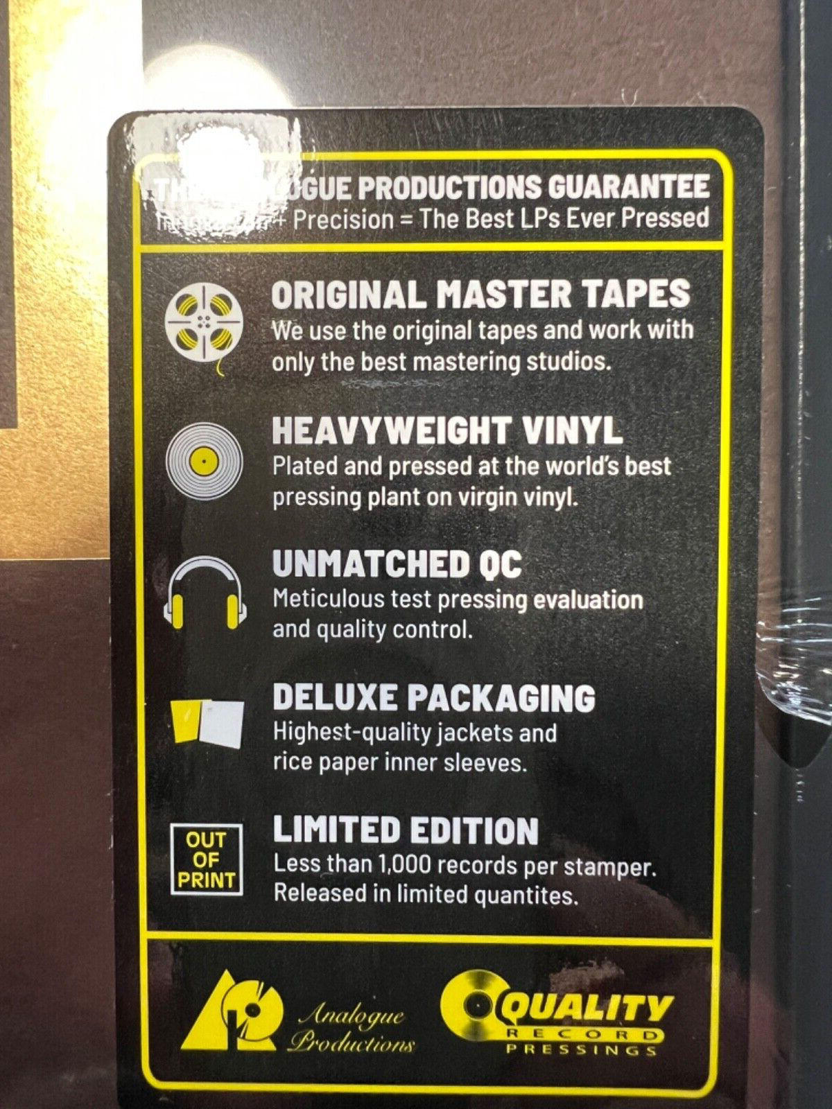 There are two stickers on the shrink-wrap front - circular '100% Analog Masters' and rectangular hype for 'The Analoque Productions Guarantee'. On the shrink-wrap back is a barcode sticker with the internal catalog number 'AUHQR 0016'.
