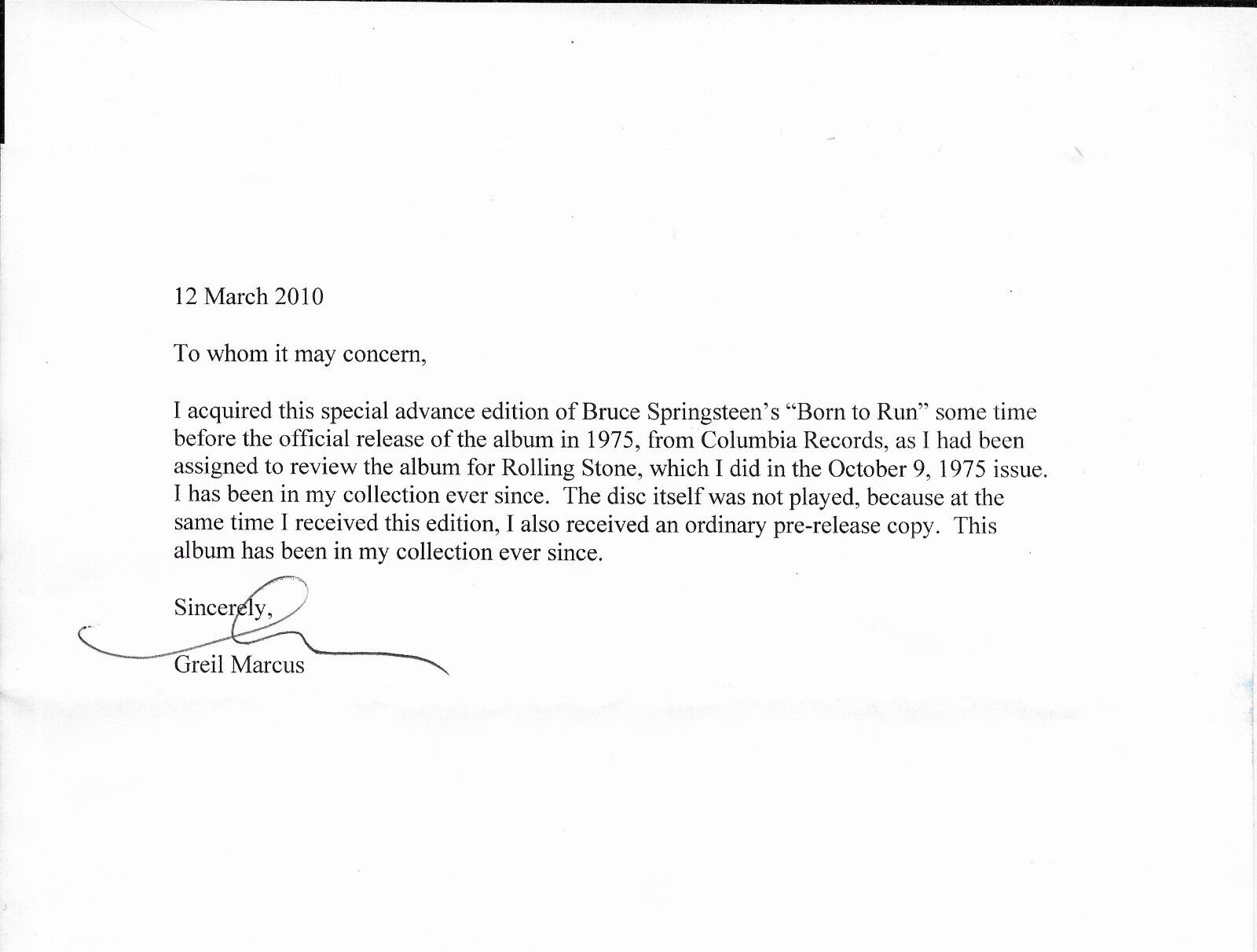This is the original U.S. script cover copy of the 1975 Bruce Springsteen test pressing Lp "Born To Run". The record appears to be unplayed near mint and the gatefold cover near mint minus condition with a bent bottom left corner. This is the actual copy of "Born To Run" sent to music journalist Greil Marcus for review for Rolling Stone magazine and a letter signed by Mr. Marcus is enclosed with the record.