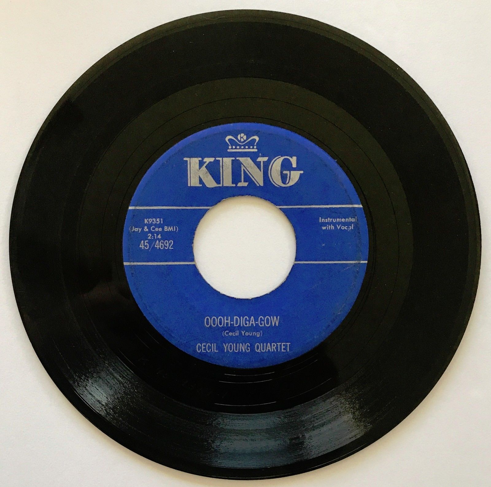 A beautiful original 45 rpm copy of King 4692, a real obscurity. Condition is a very strong VG with excellent playback. Labels are also excellent--note the tiny writing on one of them. The audio linked below comes directly from this copy:
