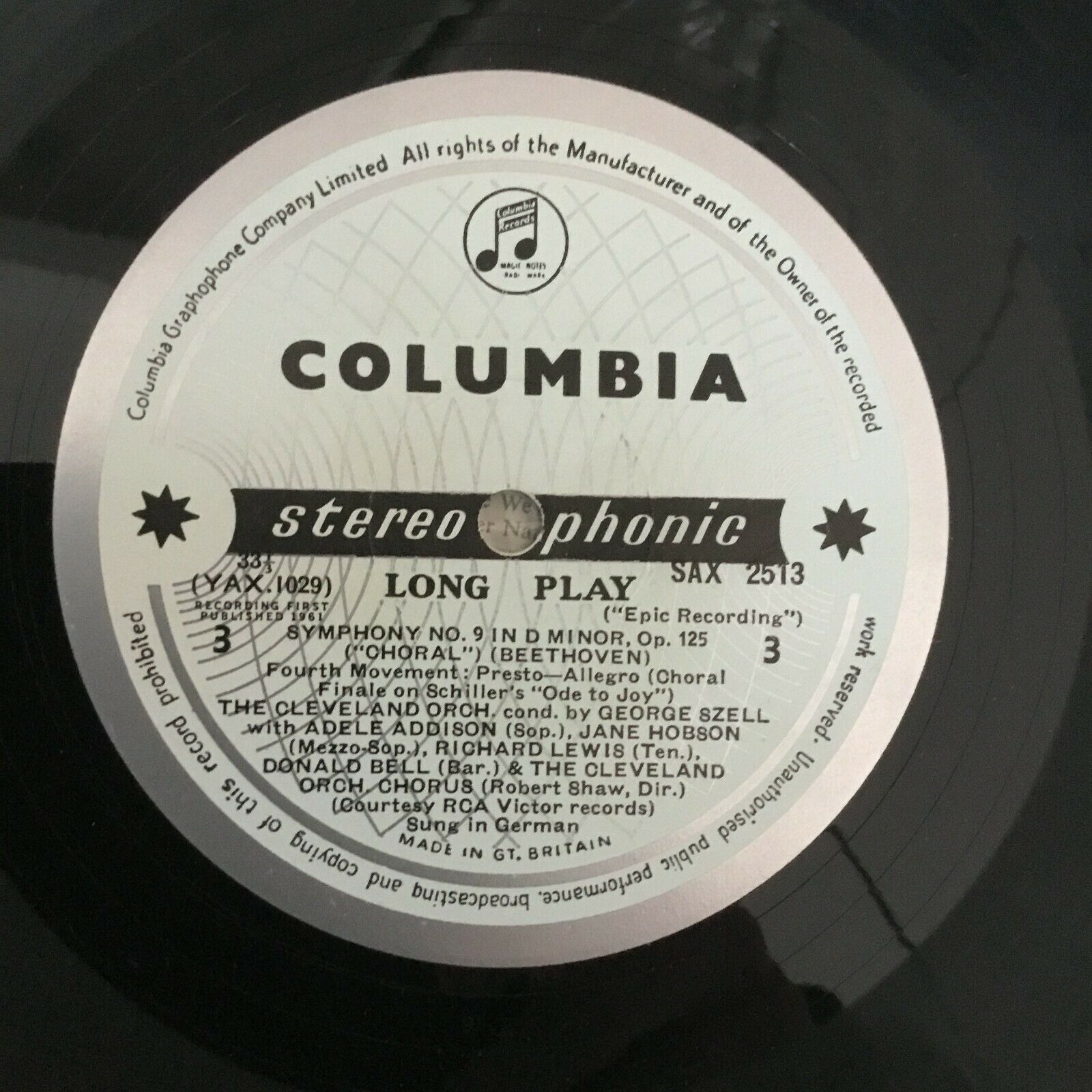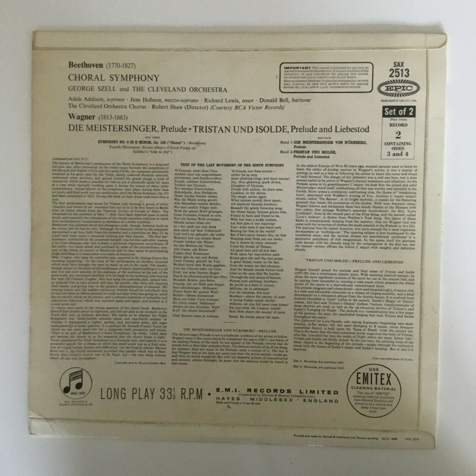 Columbia SAX ED1 blue silver UK original. George Szell conducts the Cleveland Orchestra in Beethoven's 9th symphony. Record 2 ocf 2.