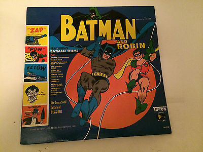 Estate found is this surprisingly fresh copy of the 1966 BATMAN and ROBIN LP on TIFTON. #780023. Features the sensational guitars of Dan & Dale but from what I have read in other listings this LP also features SUN RA and some of his band members as well as members of THE BLUES PROJECT. Great cover art in bright vivid colors; looks as if the shrink wrap could have been just removed. Back cover has some minor scuff on top. Contains inner sleeve whose art matches the back cover. Inner sleeve has creases on bottom which is very common with LPs. The vinyl itself is very black (hopefully the photo reflects this) and looks to be in excellent condition (there are a couple of scuffs). I do not have the ability to play the LP and I am not a LP collector. Trying to describe as best as possible knowing how rare and desirable this LP is. Considering this is almost 50 years old it looks great. Please ask any questions you might have and use the zoom feature to examine more closely.