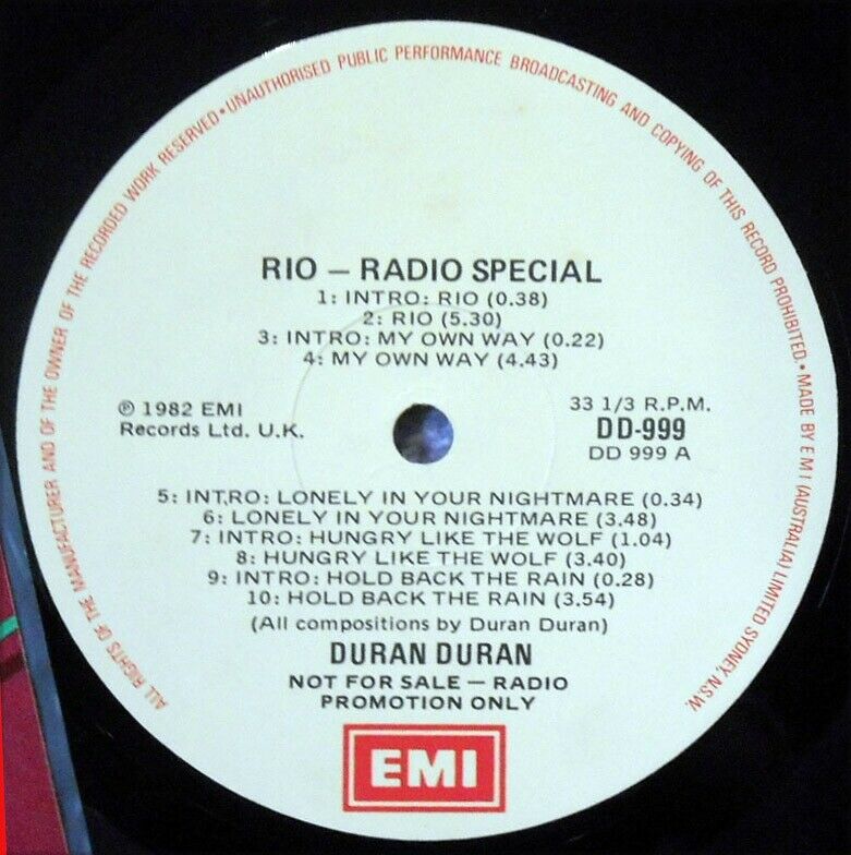 Tracks : Intro: Rio/ Rio/ Intro: My own way/ My own way/ Intro: Lonely in your nightmare/ Lonely in your nightmare/ Intro: Hungry like the wolf/ Hungry like the wolf/ Intro: Hold back the rain/ Hold back the rain/ Intro: New religion/ New religion/ Intro: Last chance on the stairway/ Last chance on the stairway/ Intro: Save a prayer/ Save a prayer/ Intro: The chauffeur/ The chauffeur/ Album promos for radio station: Stay tuned/ Later tonight/ Later on/ Later this week. There are no signs of spindle marks on labels. Record is in Near Mint condition. Cover has minor scuffing on bottom corners and a few tiny crease marks along spine and is in VG+ condition..