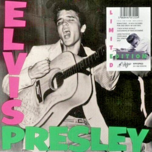"The Original seminal first Elvis album (U.S. version) re-mastered on Pink & Green colored vinyl. Plus, fold Out Poster of the original uncropped photo from the album cover. Plus, a 7” color 16-page booklet including rare photos and liner notes by Mojo writer and author Max Decharne. Limited to 800 10” 180 gram vinyl copies, globally - 1 Copy Per Order."