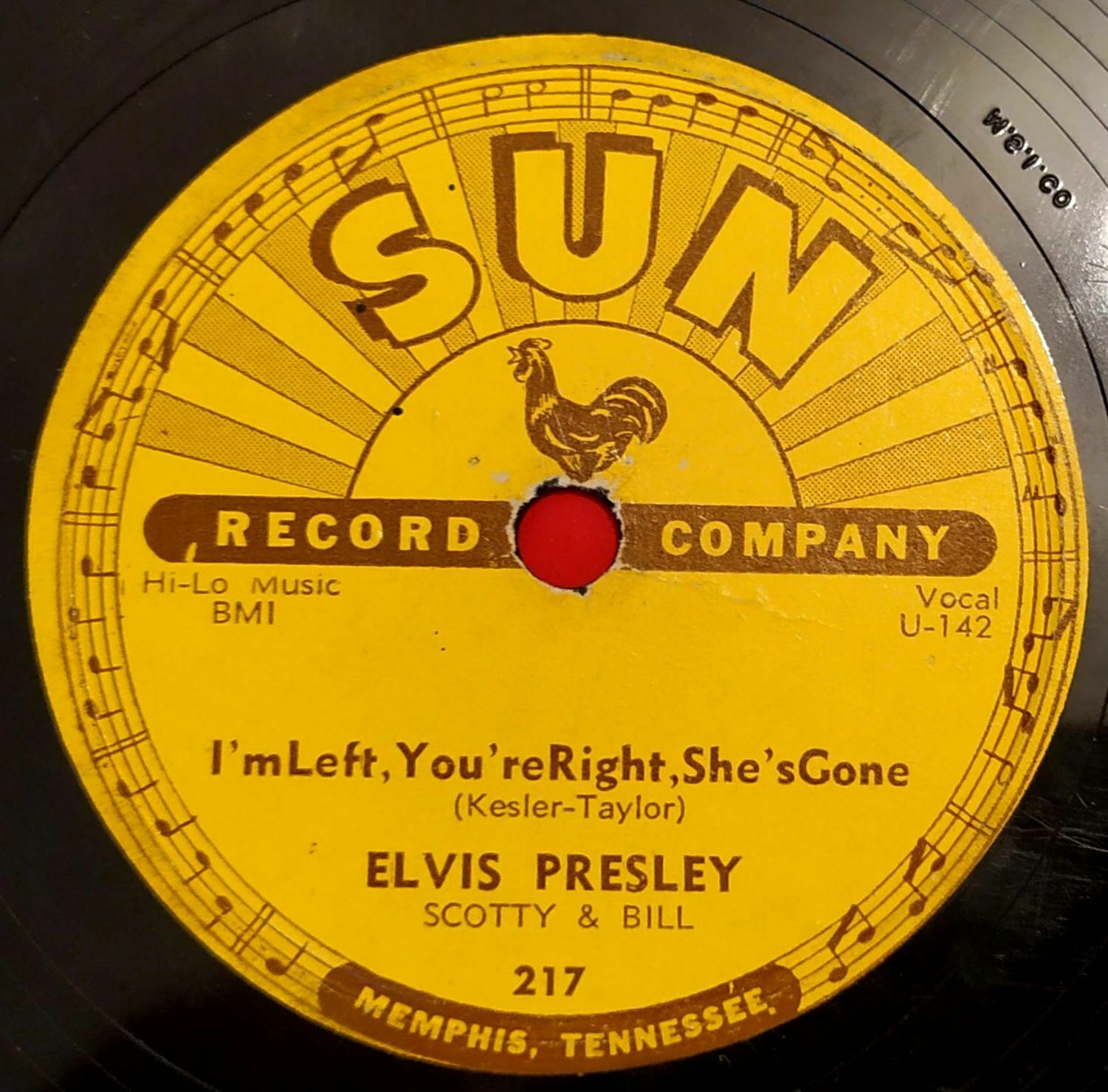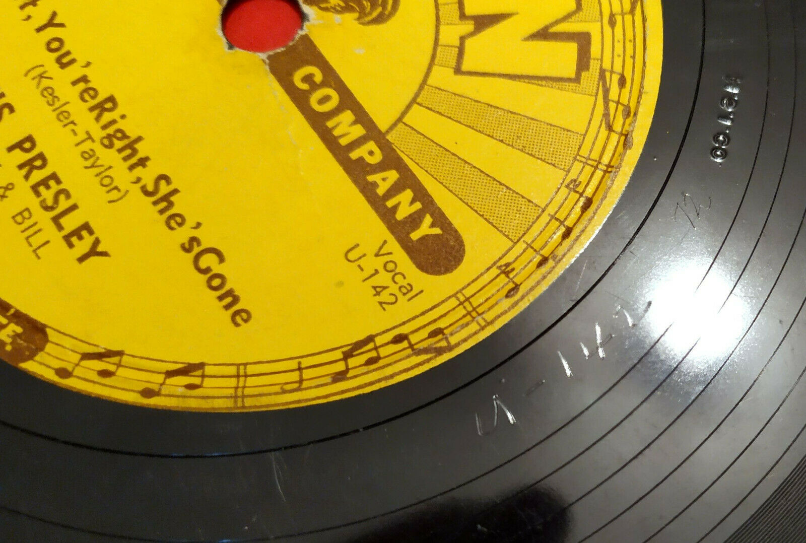 This may be considered the earliest outsourced MSI pressing of an Elvis Sun record. It predates Mystery Train by nearly a year which is well documented. This little gem may be a sleeper and is not documented anywhere else. Sun records were pressed at Plastic Product of Memphis, Sam Hodge's Paramount Record Manufacturing and occasionally outsourced M.S.I. Company in Philadelphia for overflow orders. As if Sun records are not desirable enough, the M.S.I. Co. pressings are rare in scarcity and desirability.
