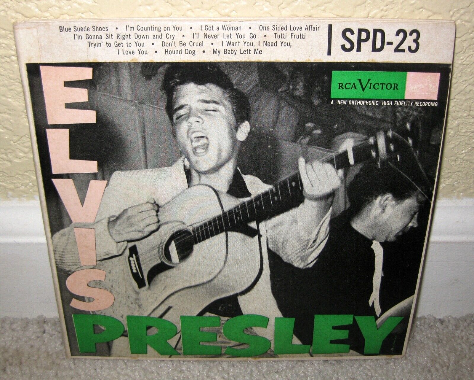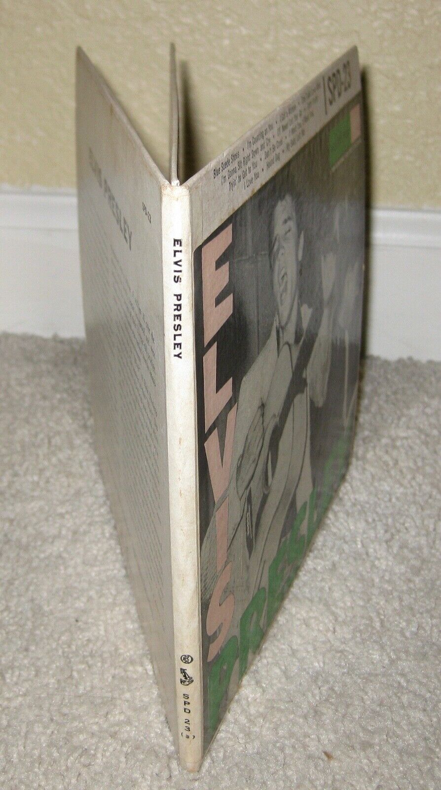 Original 1950s Elvis Presley, self-titled, three-EP set with gatefold cover on the RCA Victor label SPD-23 (first pressing; black labels with the Nipper dog at the top and with the horizontal silver line). This is a guaranteed original pressing; the matrix numbers are machine stamped in the trailoff area of all six sides of the records. This very rare set was a bonus/promotional item that was available only to buyers of a higher-priced, Elvis Presley "signature model" Victrola 45 rpm record player back in 1956. It was never sold separately to the general record-buying public. This is a very unique opportunity to own this set complete and in exceptionally clean, way above-average condition!! Grading is as follows: