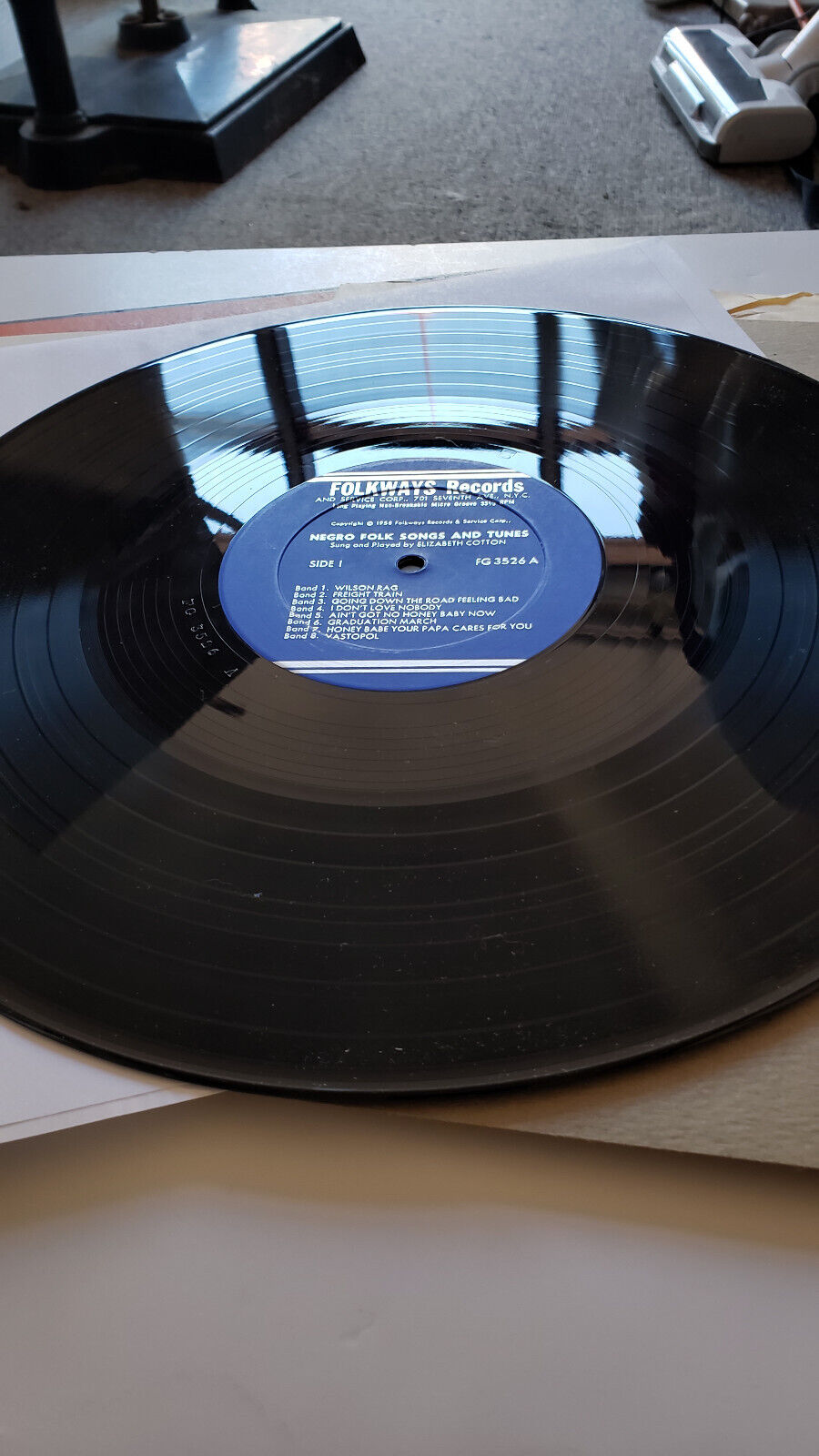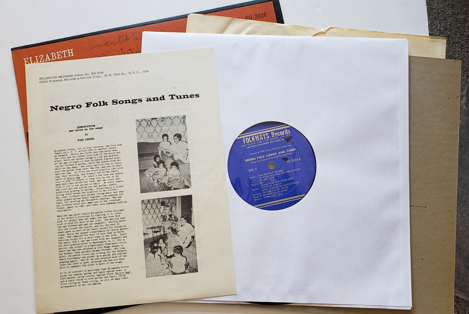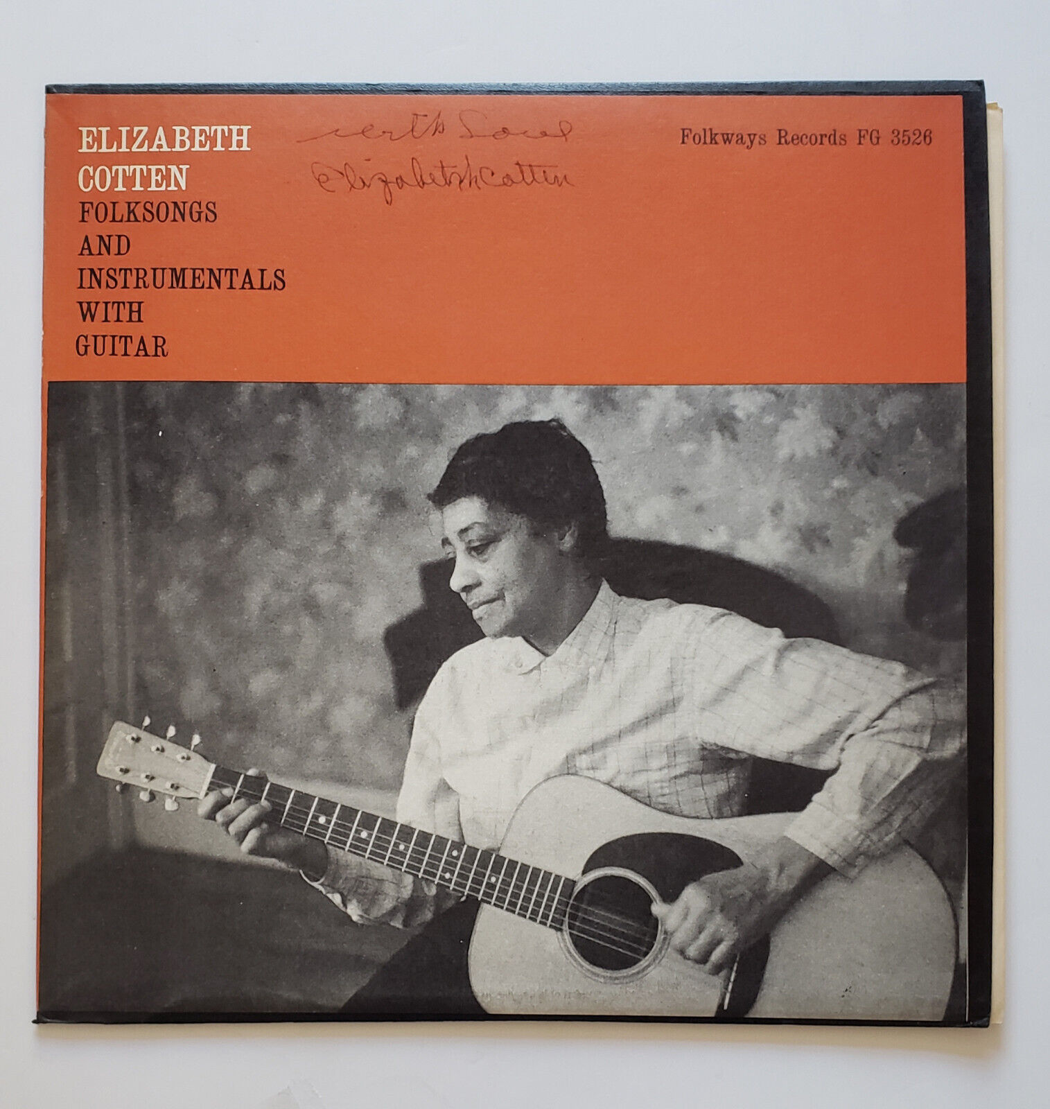 This is the Folkways Records FG 3526 Elizabeth Cotten "Folksongs And Instrumentals With Guitar", in nice condition, vinyl looks very clean, signed by Cotten on cover, includes original 4 page insert and cardboard reinforcement. Buyer pays 6.00 shipping.