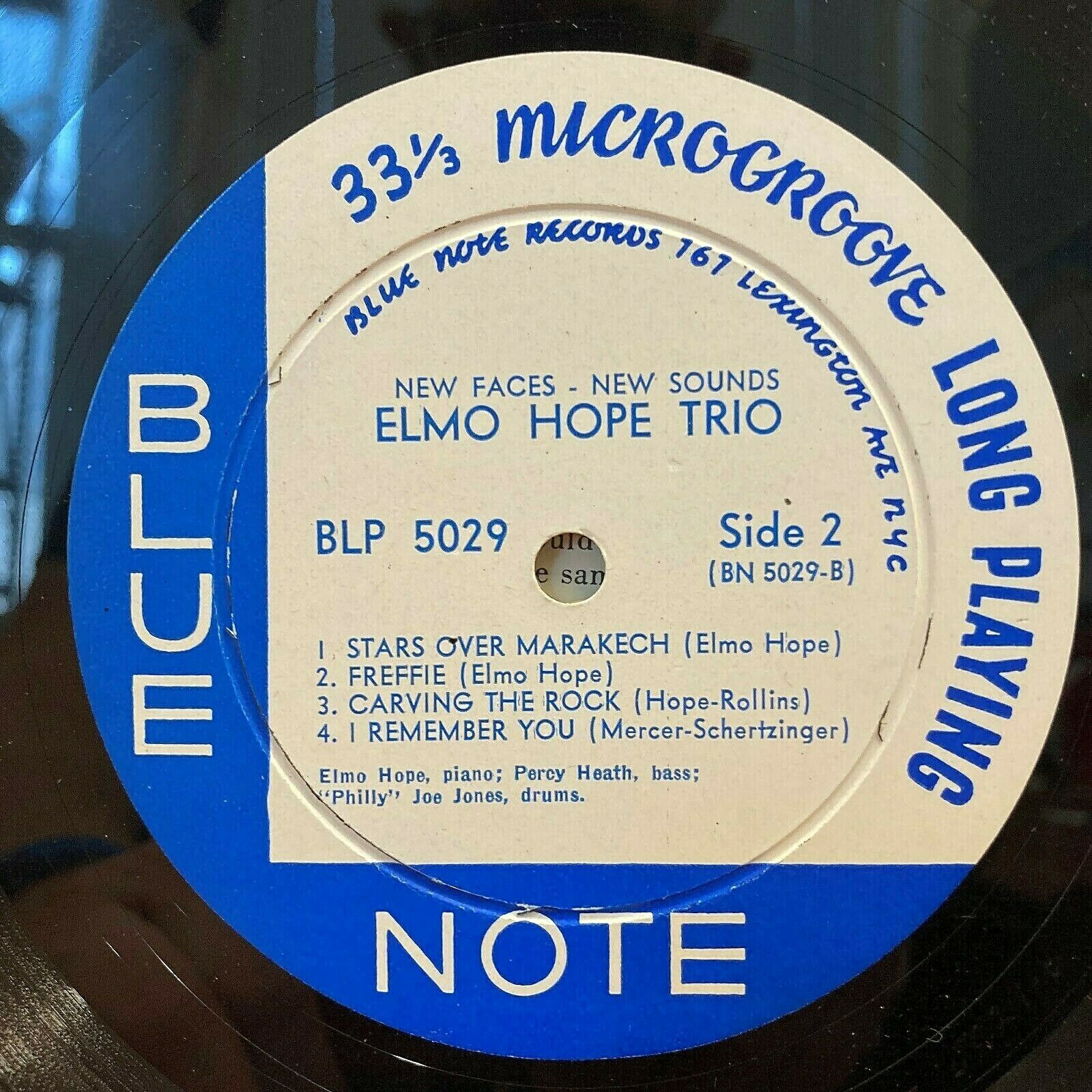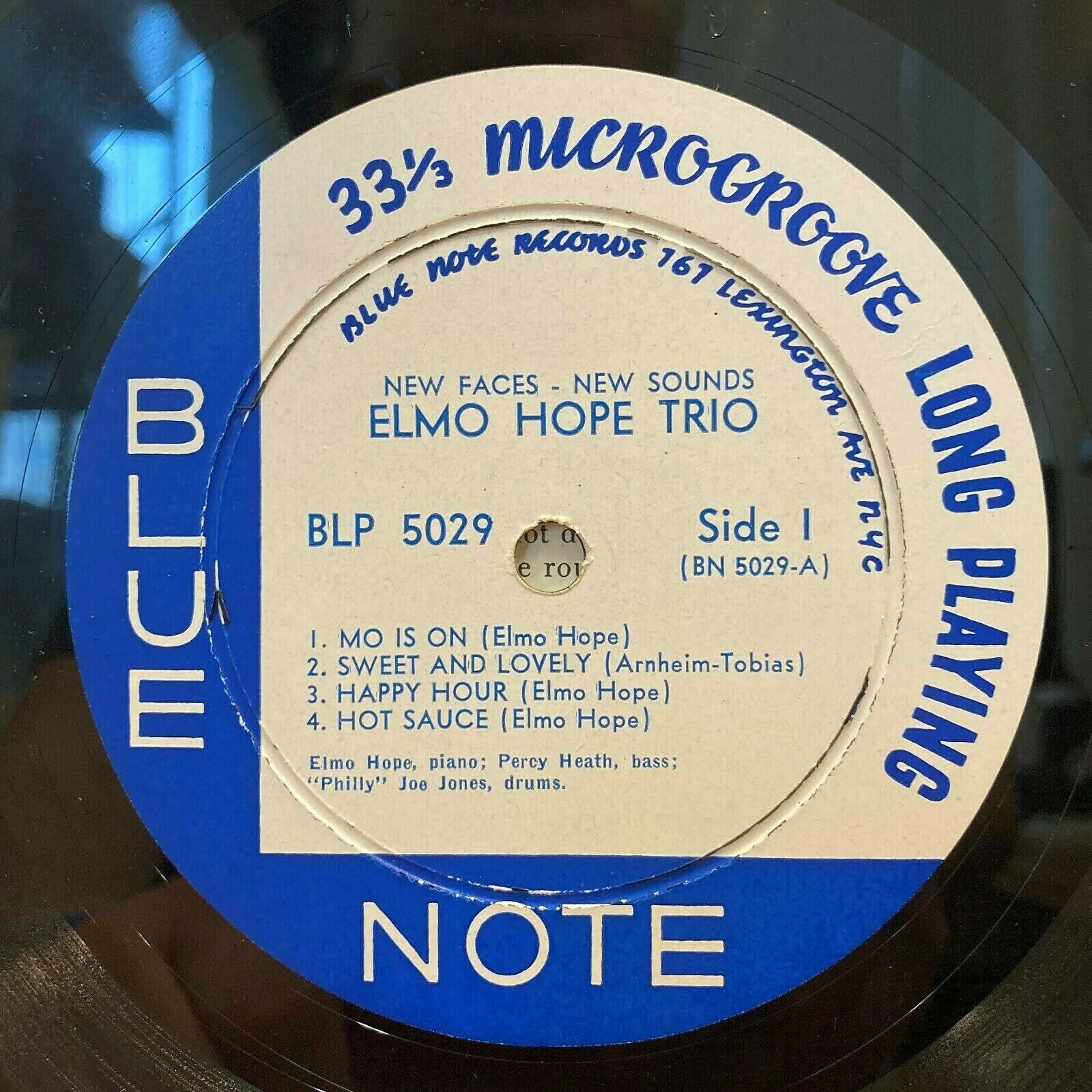 This is the original 10” deep-groove “P”-pressing of Elmo Hope “New Faces – New Sounds” on the Lexington Avenue labels of Blue Note BLP 5029. The flat rim playing surface is near-new condition, with a high luster; perhaps played once. The coated frame cover is in excellent condition – clean and bright throughout; the bottom seam shows light rubbing and ½” wear at the opening.
