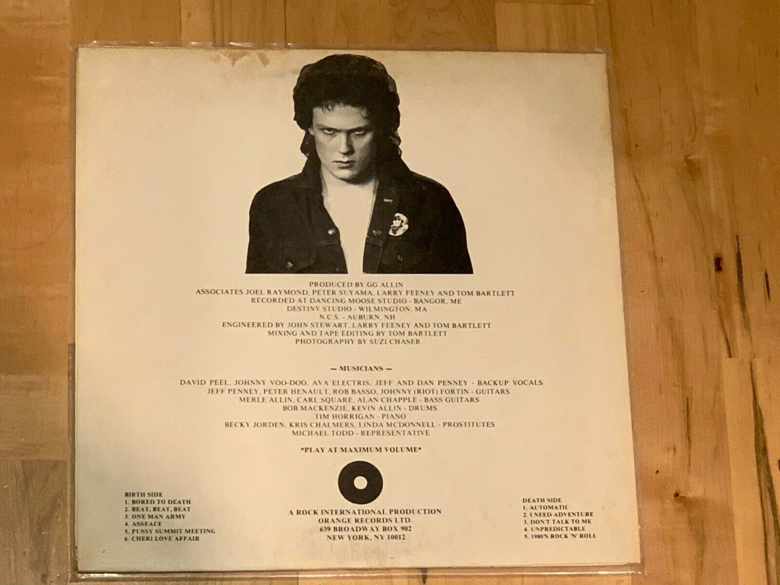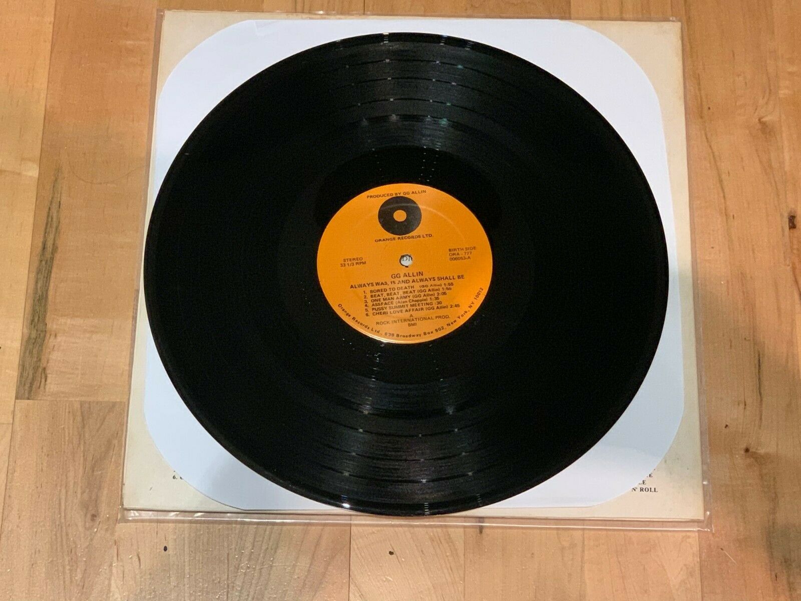 GG Allin "Always Was, Is And Always Shall Be" LP, original press on Orange Records Ltd, 1980. Not a promo or cutout. NOT a repress or bootleg, but the real deal! OG US pressing. The record has a warp which is apparent when playing the A-side (these were pressed on very thin vinyl), but plays perfectly and is very clean.