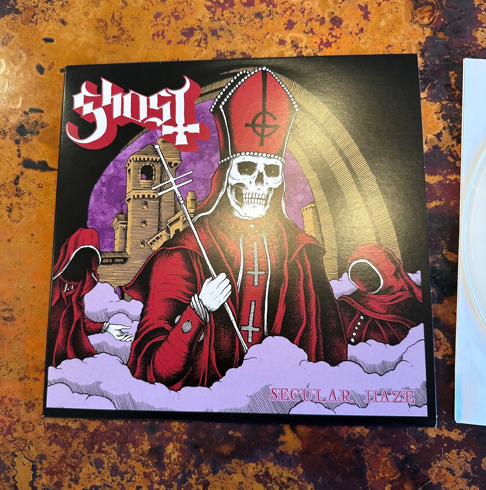 Ghost Secular Haze 10" record on clear frosted vinyl. This Swedish pressing form 2013 was super limited - only 200 total pressed. This copy is in fantastic condition - record is unplayed and is near mint + while the cover is close to near mint w/ the only flaw being a very small seam split on the top edge (see last picture). It came that way from the store. Must have for the serious Ghost vinyl collector.