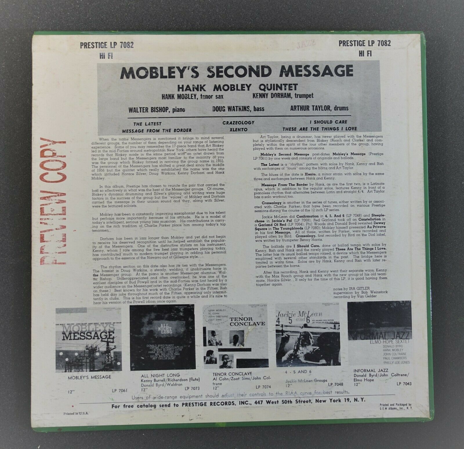 HANK MOBLEY QUINTET 'MOBLEY'S SECOND MESSAGE' PRLP 7082.PROMOTION.DG 446W.FLAT