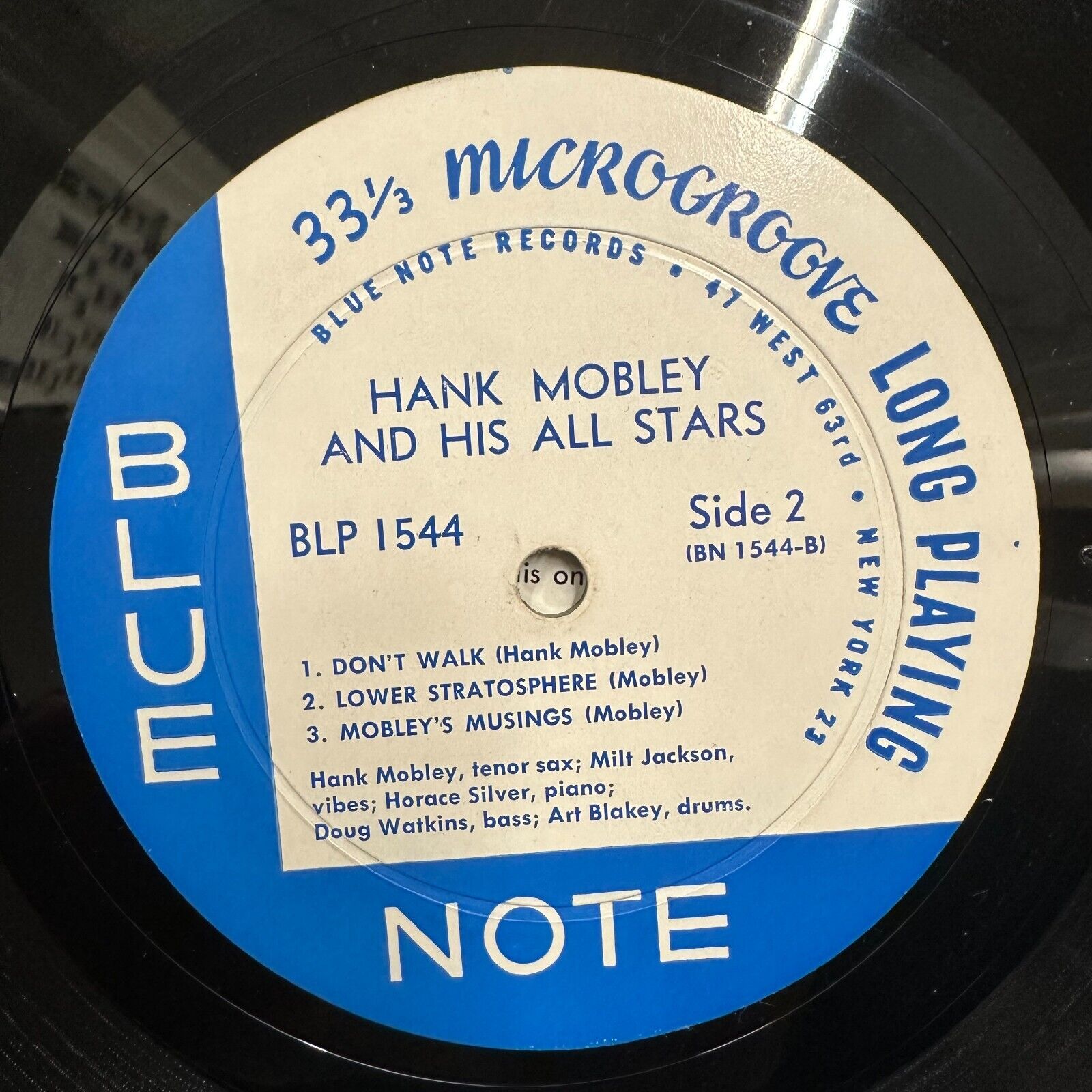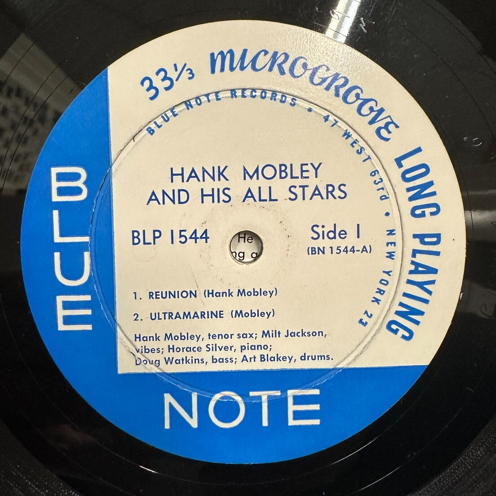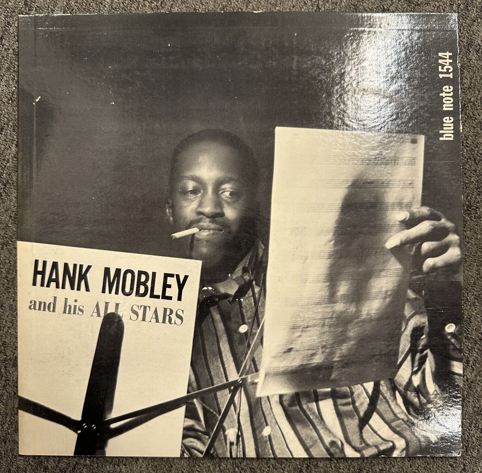 This is the original deep groove RVG-etched “P”-pressing of Hank Mobley “And His All Stars” on the New York 23 labels of Blue Note BLP 1544. The flat rim playing surface is in excellent condition with a beautiful luster and an unworn spindle hole; however, there is a lightly audible needle drop near the beginning of the second track on Side 1 as well as occasional non-repetitive light tics throughout. The original coated West 63rd St. cover is in exceptional near-new condition – bright, clean, and immaculate throughout – with just 1/8” wear on the bottom seam, at the opening, and two creases on the right edge of the back slick. $750.00