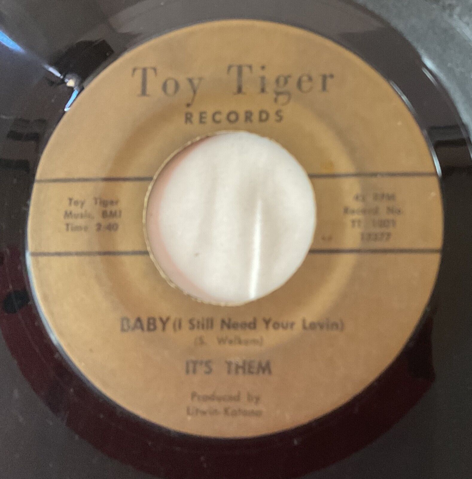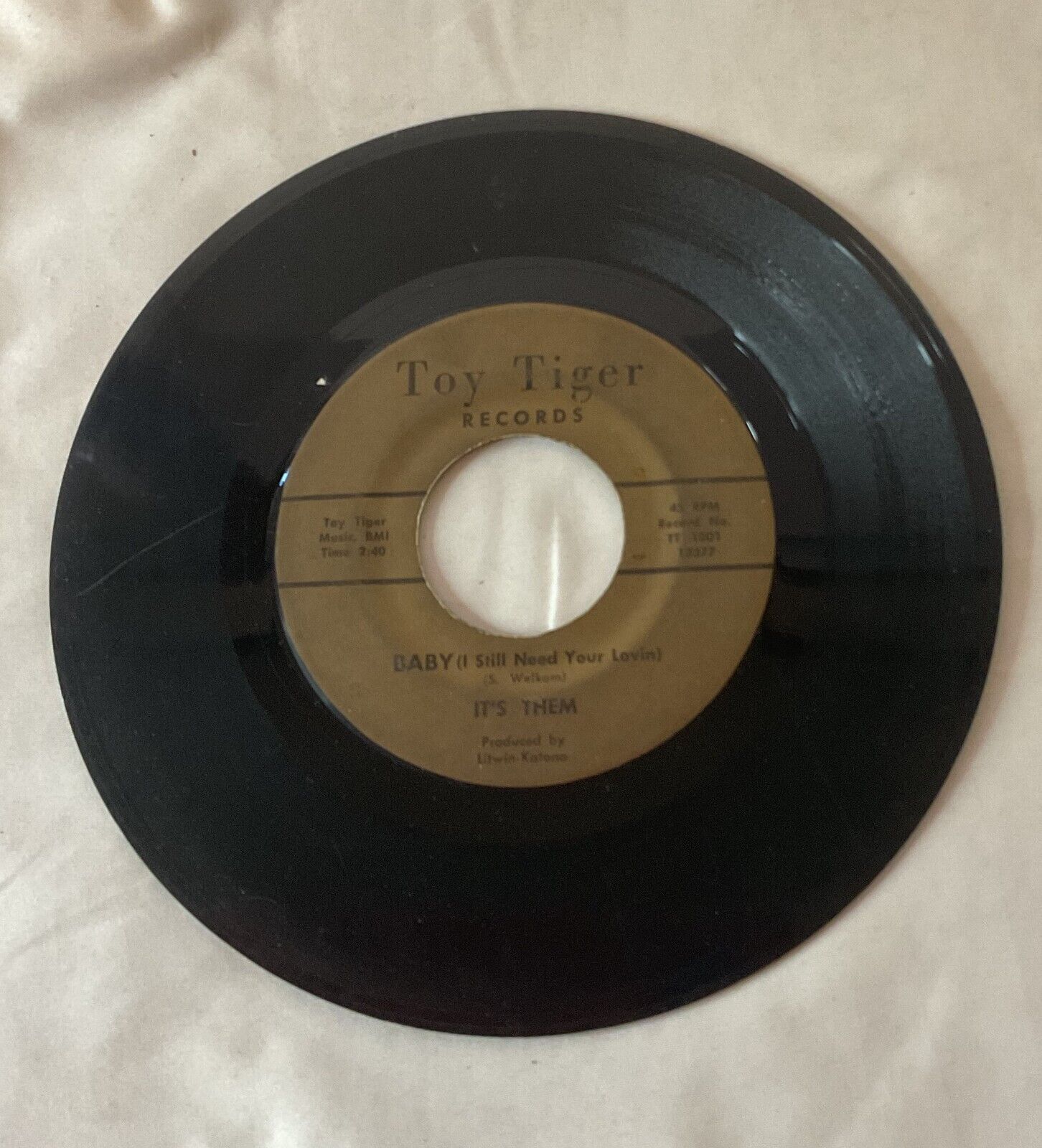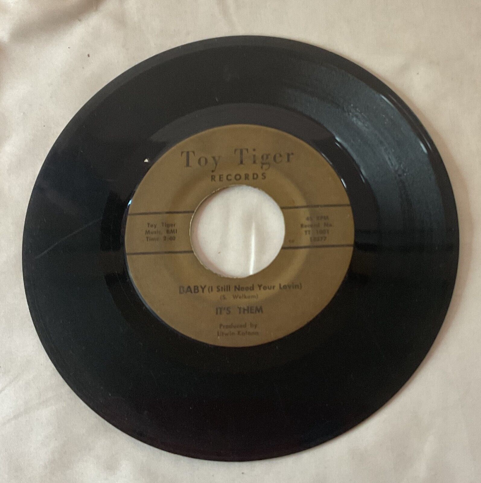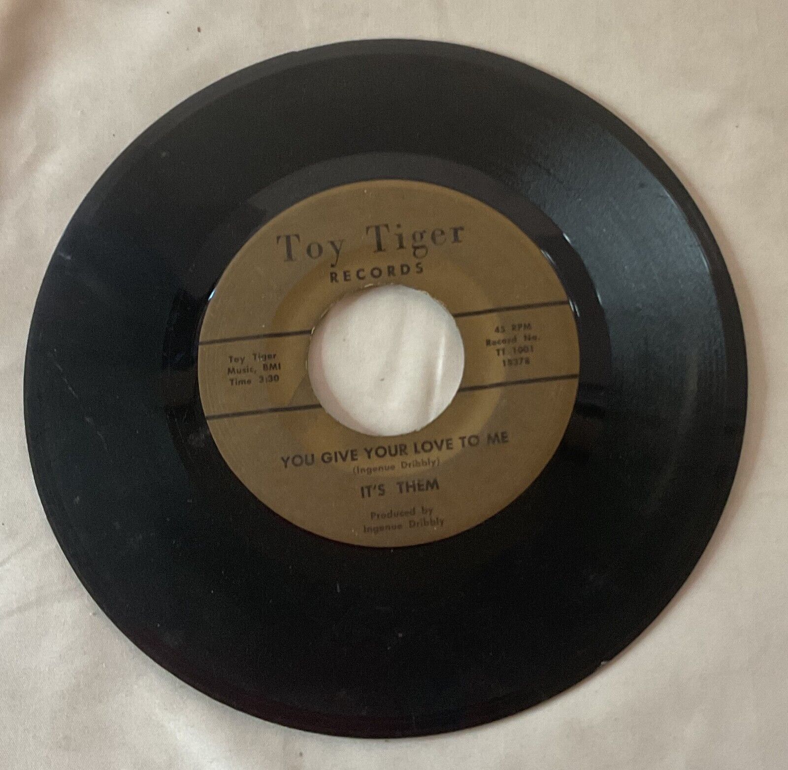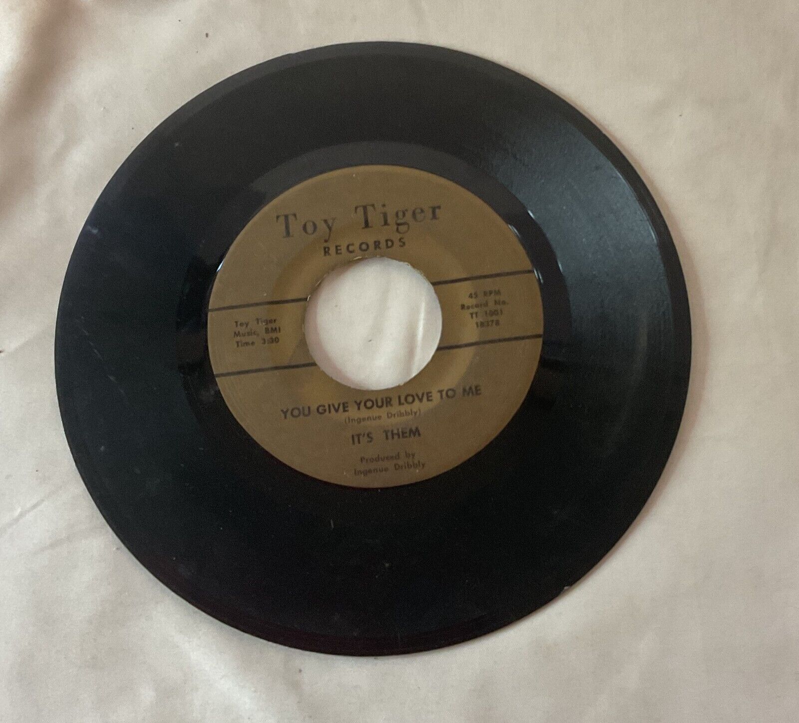 Up for sale we have a It's Them You Give Your Love to Me/Baby I Still Need You 45 Toy Tiger 1001 Cincinnati/ Hamilton OHIO. Some scratches, scuffs and general wear as pictured. Please see pictures and email me with any questions.