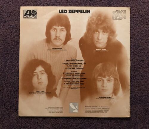 This highly sought after first pressing of the classic debut Led Zeppelin album was available for a very short time before the sleeve was replaced with the orange lettered design. The first orange sleeves retained the 'Uptight An' Outtasight' Atlantic Appreciation Society flash on the back, although this was soon replaced too.