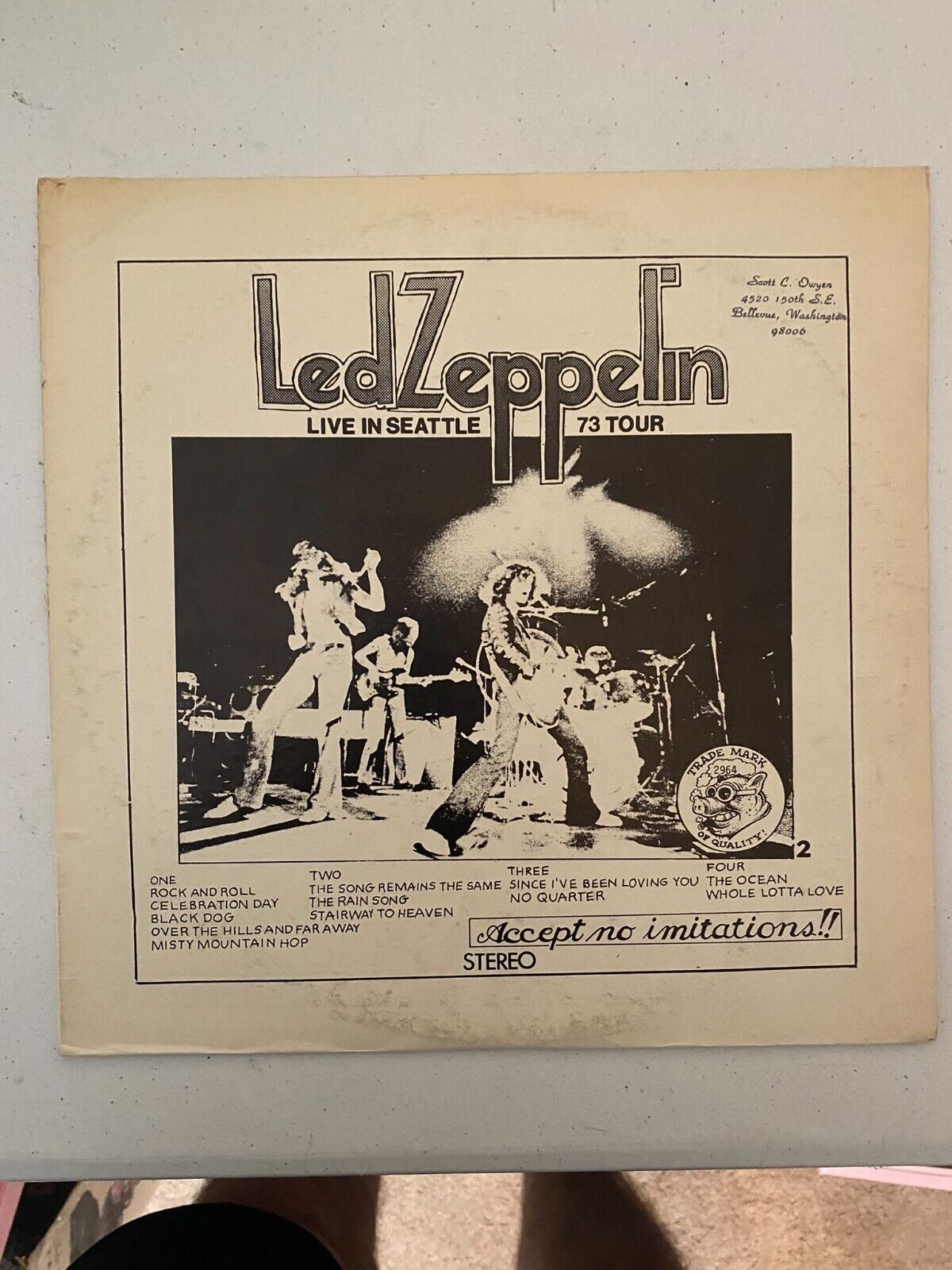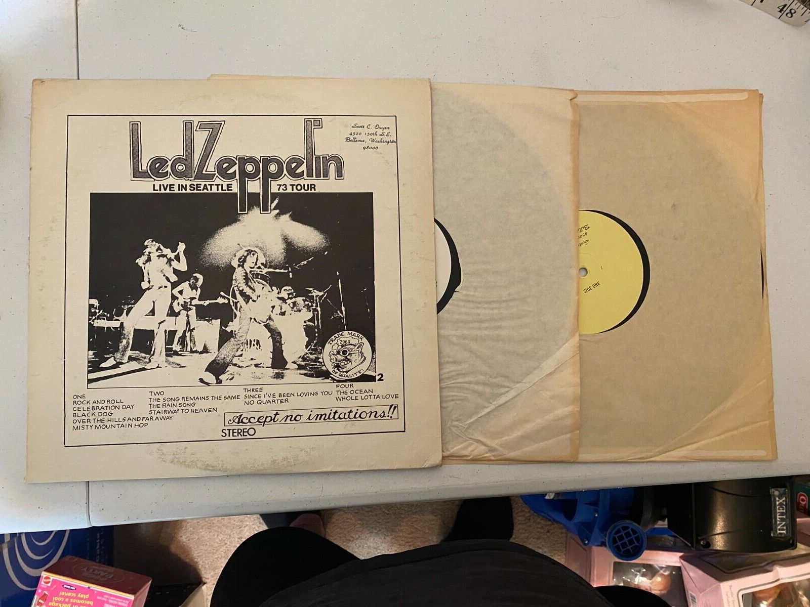 Up for sale is an incredible piece of music history: Led Zeppelin Live In Seattle 73 Tour - a 2 LP Double Vinyl Records set. As the original owner, I have preserved these vinyl records with great care, and they are still in the clear plastic sleeve, complete with the price tag from the store as a nostalgic reminder of its purchase.