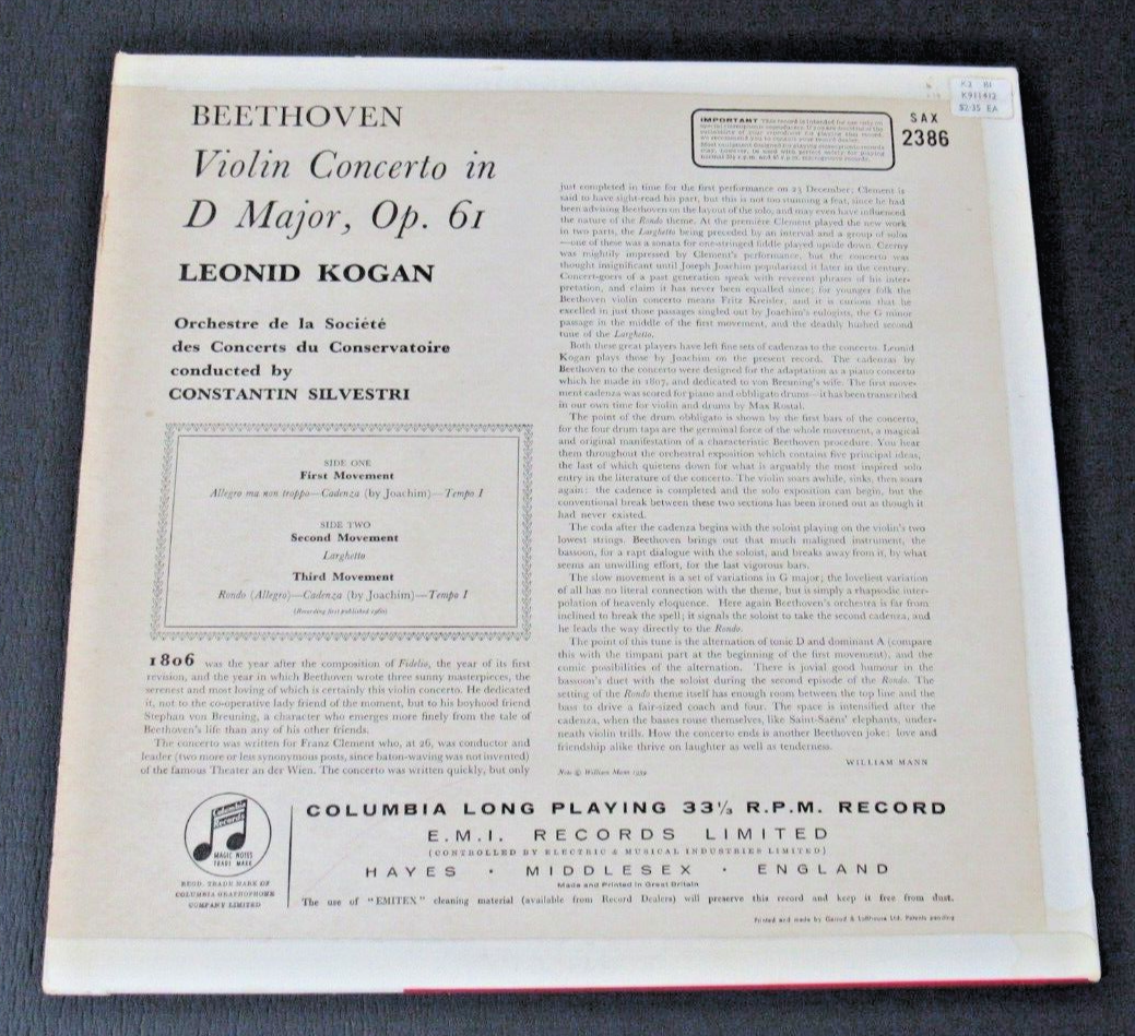 Artist: Leonid Kogan, Violin, Constantin Silvestri, Conductor Title: Beethoven, Violin Conderto in D Major, Op. 61 Label/Number: Columbia SAX 2386 (S) Jacket condition: EX Record condition: EX Notes: This is a 1961 UK pressing. The cover is in nice condition with a little ring wear and some very minor shelf wear. There is some minor age yellowing along the opening on the back, a small original price sticker on the top right corner of the back, and the bottom seam is split for about a half-inch at the opening. Overall a nice EX copy. The labels are in very nice condition with no flaws of note. The vinyl is bright and glossy and overall appears to be at least NM with no obvious scratches. However, I played it, just to listen to it, and discovered a couple of tiny, nearly invisible, but "feelable" scratches at the very beginning of Side 1 that create a light tick for a few revolutions at the intro. Furthermore, the record plays with some occasional light surface noise in some of the quieter passages, more so on Side 1 than on Side 2. I've cleaned the record with my Spin Wash so I'm assuming the occasional surface noise is a part of the pressing itself. As noted, it's occasional, in the quieter passages, and not particulary distracting. As an added bonus the record is still contained in its original company poly-lined inner sleeve. Grading: Grading is usually only visual for VG+ or better items, although if time allows I may play to verify the quality of a pressing or just to hear the music. VG items are usually only listed if they are fairly hard-to-find items and are always play graded. Regardless of the grade, if I do play the LP, I note the results in the item description. I use Goldmine standards with Ebay's EX grade added for items NOT QUITE up to NM. Please read the notes above as I try to note anything that might influence the grading one way or another. I try to be conservative and grade as though I were buying the record and hope my feedback speaks well for my grading. Mono (M) or Stereo (S) is noted after catalog number. Don't hesitate to e-mail questions.
