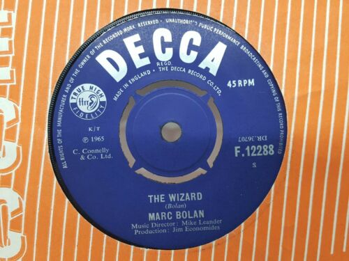 * MARC BOLAN * THE WIZARD * DECCA F. 12288 * 1965 1ST PRESSING * SUPER RARE * NM. COMPANY SLEEVE * VINYL IS NM CONDITION * LOOKS HARDLY PLAYED * PLAYTESTED SUPERB * ONE FOR THE REAL COLLECTORS * VINYL WILL BE SENT SIGNED AND TRACKED SPECIAL DELIVERY * OVERSEAS BUYERS PLEASE MESSAGE BEFORE BIDDING THANKYOU.