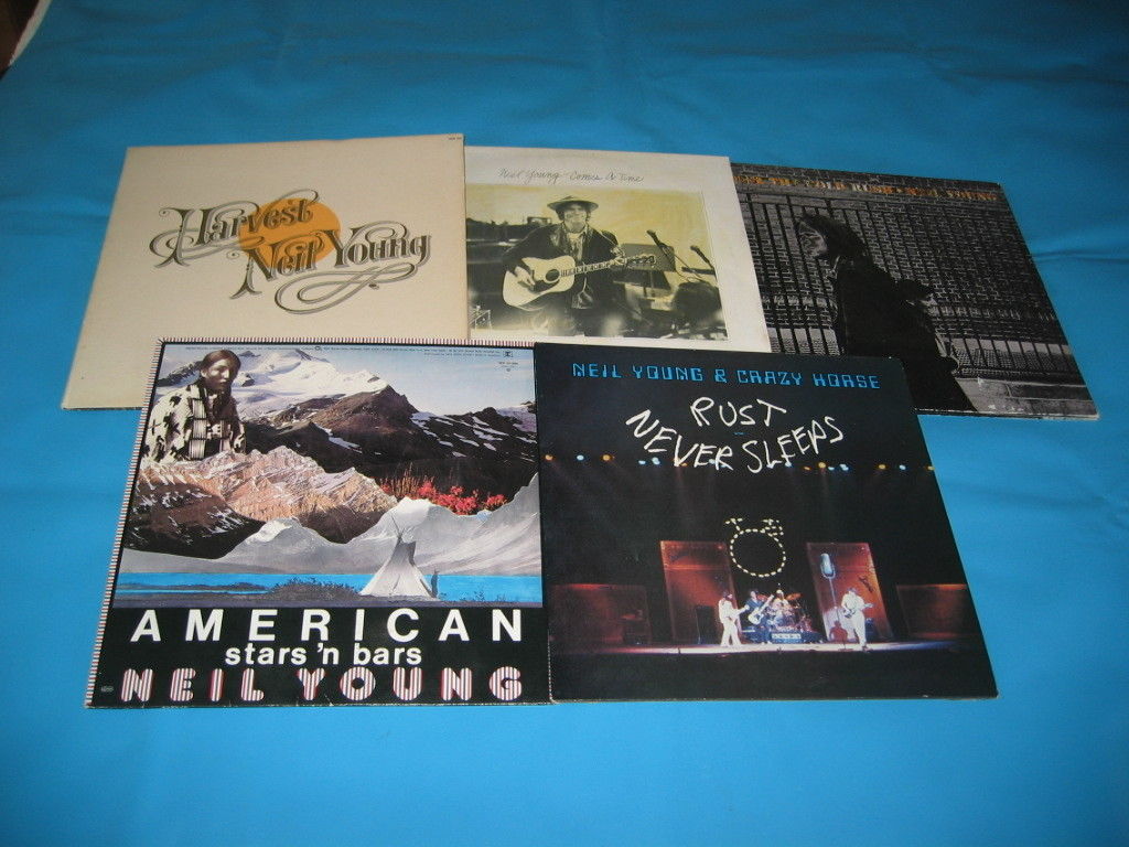 5 NEIL YOUNG LPs *** All the LPs are on Green Reprise Steamboat Label " Rust Never Sleeps" K 54105 1979 with inner picture sleeve Record EX+ Inner Sleeve EX Outer Sleeve slight damage on back VG+ " American Stars 'n Bars " REP 54088 1977 with inner lyric sheet Record EX+ Sleeve & Inner Sleeve VG+ " After the Gold Rush " REP 44088 1970 GERMAN Record EX+ Sleeve VG slight storage wear " Harvest " MSK 2277 1972 USA with G/F Lyric Sheet Record EX+ G/F Sleeve and Inner Lyric sheet EX " Comes a Time " REP 54099 1978 Record EX+ Sleeve VG slight storage damage All the Vinyl Records in Great Condition