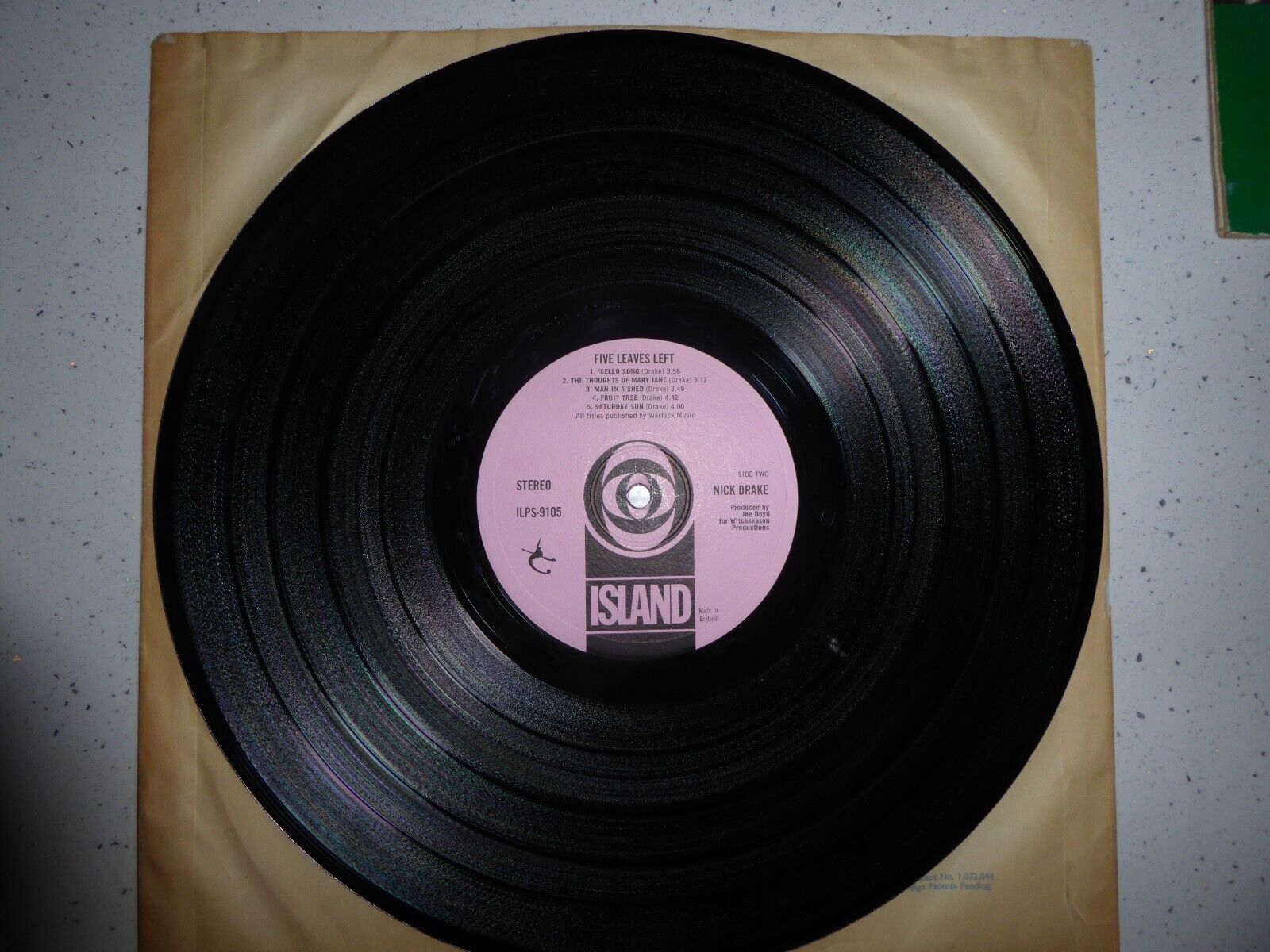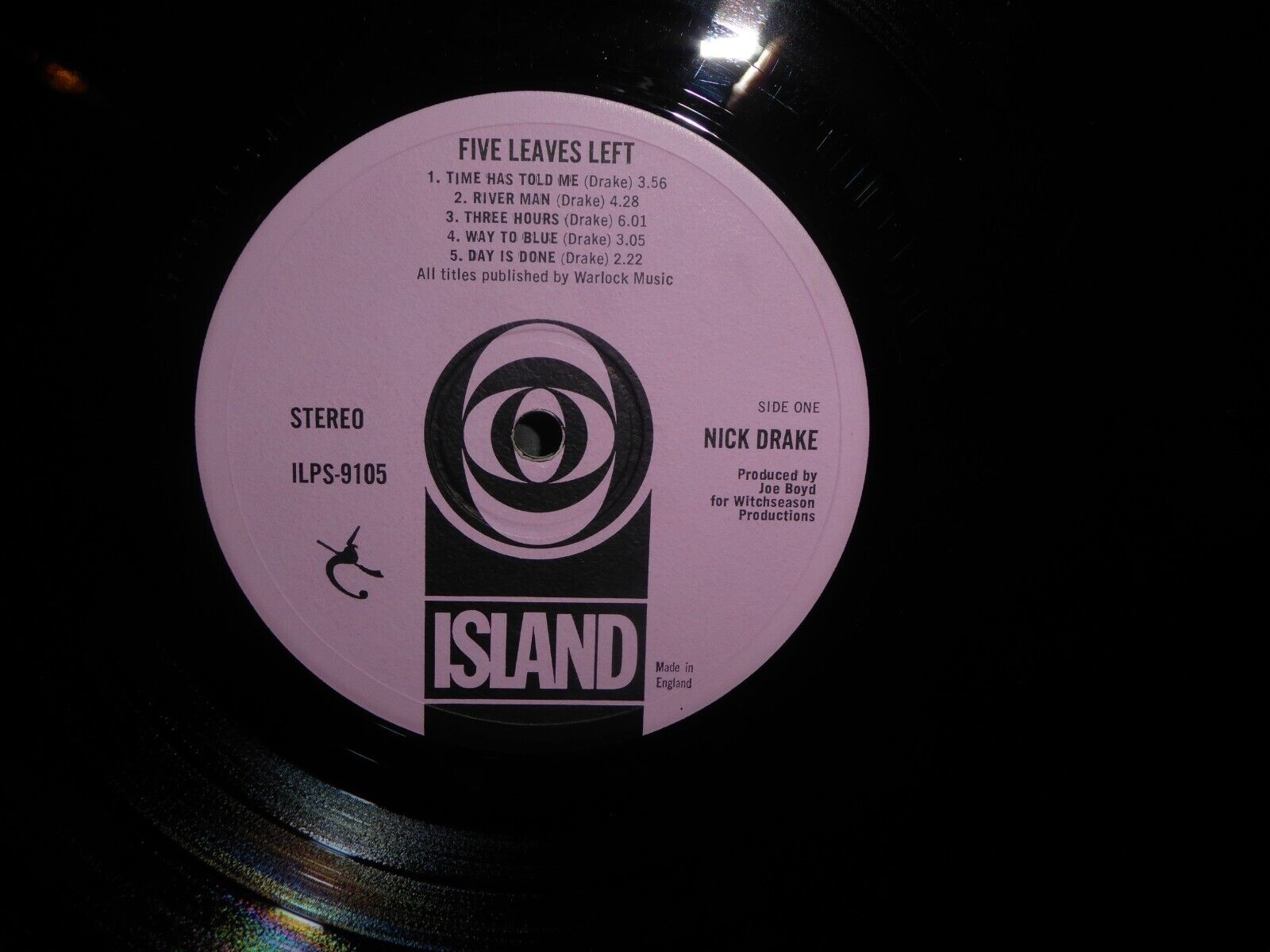 The vinyl is where this copy truly comes into its own. When this heavy slab of 1960s wax is tilted into the light it shimmers like black glass, it has the very highest luster sheen normally seen only on a record that is brand new. BEAUTIFUL . There are a few of the very slightest spidery web lines that are on every single LP that has ever been removed from its inner sleeve but nothing worth mentioning that remotely indicates trouble. This is a real corker ! For 32 years I have stored this LP in the mastering sleeve visible in the pictures and its paid off . It plays as great as it looks. I actually cant fault the playback on this LP it plays as close to mint as is possible. Silent between tracks in the dead wax areas and no skipping or jumping and certainly no background noise or crackle , which is a serious MUST on such a quiet LP that Five Leaves is. It plays BEAUTIFULLY ! Its truly OUTSTANDING. I have owned 6 copies of this LP over the years and this is my last and my best. You will see literally hundreds and hundreds of the smooth and the other two rough variant labels to this Variant 1 Pressing. This really is the copy you deserve in your collection. Owning this will give you a smug pride that you and your Drake collection deserve. Well worth pushing the boat out a bit further. If you allow this to slide through your fingers you will be kicking yourself for a very long time.