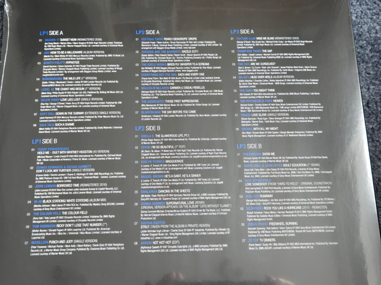 A1 Heaven 17– Sunset Now A2 ABC– How To Be A Millionaire (Album Version) A3 Scritti Politti– Hyptonise A4 Bananarama– The Wild Life (7" Version) A5 Level 42– The Chant Has Begun (7" Version) A6 Helen Terry– Love Lies Lost (Single Version) A7 Soft Cell– Down In The Subway (Extended Single Version) A8 Talk Talk– Such A Shame B1 Teddy Pendergrass Duet With Whitney Houston– Hold Me (45 Version) B2 Dennis Edwards & Siedah Garrett– Don't Look Any Further (Single Version) B3 John Lennon– Borrowed Time B4 M+M*– Black Stations/White Stations (Album Mix) B5 The Colour Field*– The Colour Field B6 Tom Robinson– Ricky Don't Lose That Number (7") B7 Marillion– Punch And Judy (Single Version) C1 Cocteau Twins– Pearly-Dewdrops' Drops C2 Siouxsie And The Banshees*– Dazzle (Edit) C3 The Icicle Works– Birds Fly (Whisper To A Scream) C4 Everything But The Girl– Each And Every One C5 Malcolm McLaren– Carmen (L'Oiseau Rebelle) C6 The Associates– Those First Impressions C7 Blancmange– The Day Before You Came D1 Sheila E.– The Glamorous Life, Pt.1 D2 Divine– I'm So Beautiful (7" Edit) D3 Evelyn Thomas– Masquerade D4 Miquel Brown– He's A Saint, He's A Sinner D5 Shalamar– Dancing In The Sheets D6 Donna Summer– Supernatural Love (Remix) D7 Sheena Easton– Strut D8 Arrow (2)– Hot Hot Hot (Edit) E1 Culture Club– Miss Me Blind E2 Thompson Twins– The Gap E3 The Fixx– Are We Ourselves? E4 Go-Go's– Head Over Heels (Album Version) E5 The Cars– You Might Think E6 The Psychedelic Furs– Heaven E7 Visage– Love Glove (Single Version) E8 Sparks– With All My Might F1 Pretenders*– Show Me F2 Daryl Hall & John Oates– Adult Education (7" Remix) F3 Rick Springfield– Love Somebody (From "Hard To Hold" - Original Soundtrack) F4 Bon Jovi– Runaway F5 Scorpions– Rock You Like A Hurricane F6 Judas Priest– Freewheel Burning F7 ZZ Top– TV Dinnersprice rating