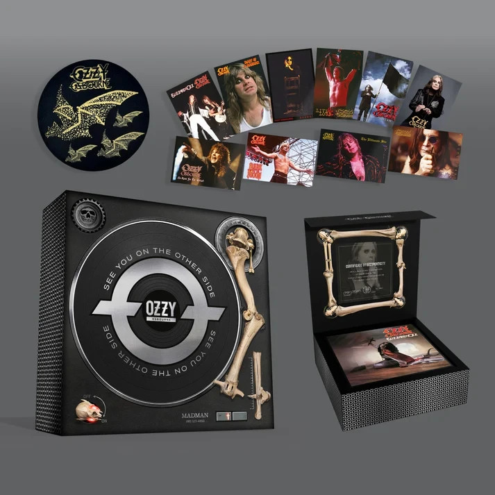 The complete vinyl works of Ozzy Osbourne's original solo material in a very limited unnumbered black vinyl box set. This unnumbered & unsigned version of 'See You On the Other Side v2.0' features 18 albums including the rarities compilation 'Flippin' the B-Side' and new additions of 'Patient Number 9' (standard album cover version) and 'Ordinary Man'. The box also includes ten full-size posters of vintage photos, a gold bat slipmat, and a certificate of Ozzthenticity.