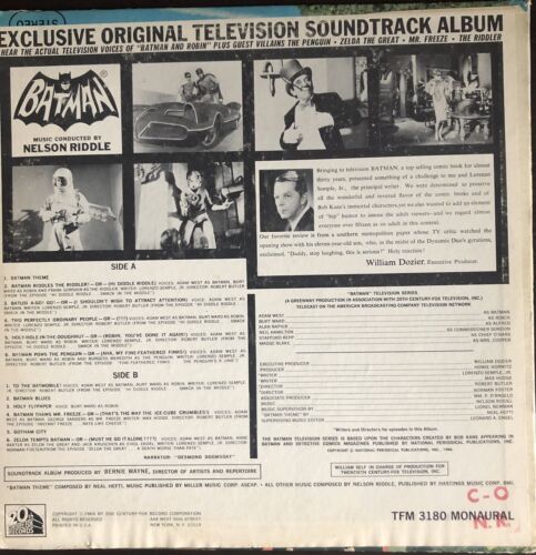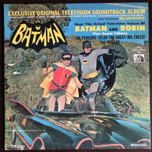 Up for sale is a Vintage, Original - Batman - Exclusive Original TelevisionSoundtrack Album. Music Conduced by Nelson Riddle. 20th Century-Fox Records. TFM 3180 Monoaural. Sleeve is in VG - some seam splitting but not too bad / Vinyl is in VG++ as well - possibly some very,very slight scuffs/scratches - it probably more dusty than anything - a good cleaning & it'll look great - it still is very bright & glossy - see photos.