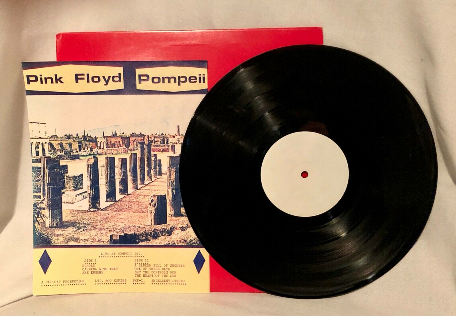 Bought this album brand new, it has no listings on either side of the LP. Played it once to check the validity of the listings on the paper. It is indeed "Live at Pompeii". Album, cover paper in mint condition. All red cover has a slight bend in one of the corners from storage. Contact seller with any questions.