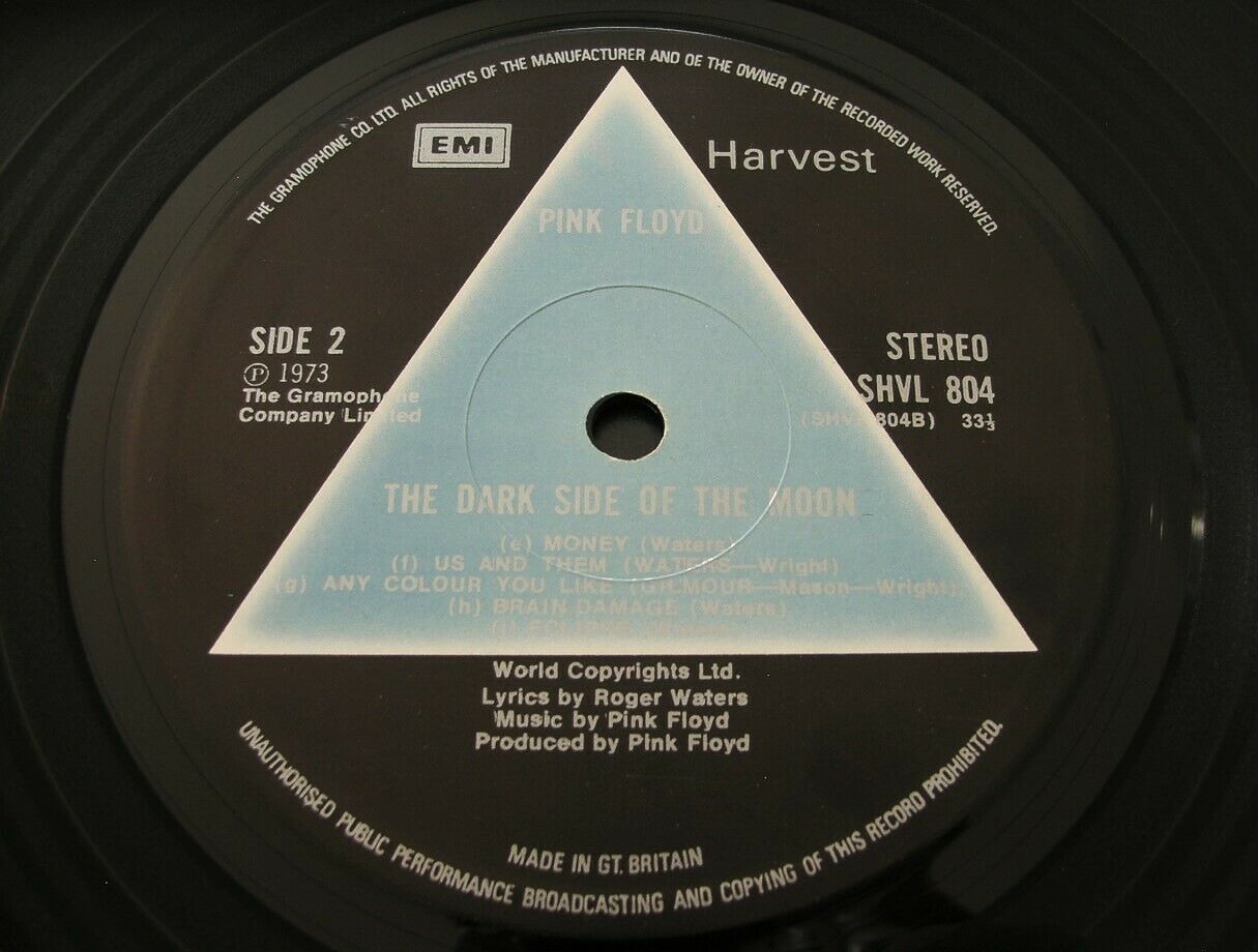 Vinyl: The vinyl looks superb and has retained its original high sheen with very little to see. In normal light there are just a handful of small or light marks and under bright, direct light there are some additional fine, wispy sleeve-removal marks, but there is nothing significant anywhere. It’s really hard to find original copies of DSOTM that look as good as this. I have played the entire record and it sounds fantastic with very little to report, and this is easily one of the best 1st pressings of DSOTM that I have heard. Please note that this copy does NOT have the pressed skip in 'Money' often found on first pressings - there are no jumps or skips anywhere on this record and the whole record was a pleasure to listen to. For the sake of completeness I would mention some minor background noise in the run-ins/outs, fades, segues and silent parts, and the occasional isolated click, but nothing significant. Like most Pink Floyd albums Dark side of the Moon has lots of quiet and sparsely arranged passages and because of this it is very hard to find an original copy which genuinely plays Mint all the way through, and there are some sections which are always 'difficult' on original vinyl copies of this album (e.g. the long-fade explosion noise at the end of 'On the Run', the heart-beat fade-in at the beginning and fade-out at the end of the album, the quiet end section of ‘The Great Gig in the Sky’, the intro to ‘Us and Them’ etc), but this copy is one of the best I’ve heard with only one issue* in these parts, with the rest of them playing superbly. For side two there is nothing else to add, so I would play-grade side two as a SAFE Near Mint (NM). On side one I heard three or four small clicks in ‘Breathe’, and maybe one or two others on side one, but the only significant thing* was a soft tic in the quiet ending to ‘The Great Gig in the Sky’ which continues into the run-out at the end of the side. But that’s it! The rest of the side is superb. But these soft clicks at the very end of the side, and a handful elsewhere, mean that I’m going to play-grade side one as Excellent (Ex). Aside from these minor issues, this is one of the best I’ve heard, even in those other ‘difficult’ bits mentioned above. This is an outstanding example and I think it would be very hard to find one which sounds better.