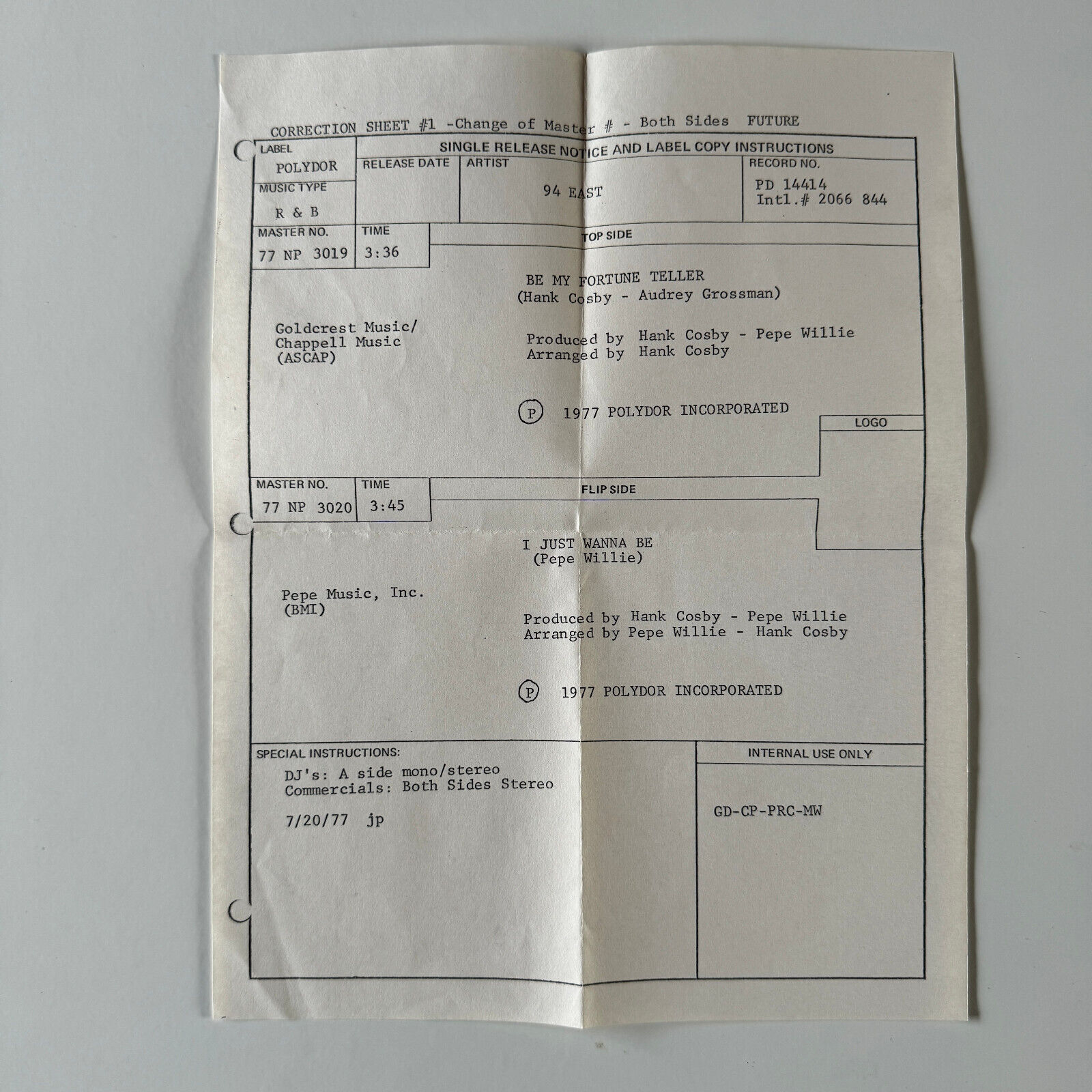 It comes in its original plain sleeve, together with a label copy sheet printed for internal purposes at the record company.